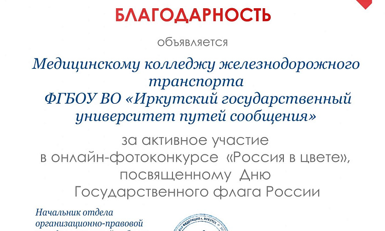 Медицинскому колледжу ЖТ ИрГУПС была объявлена благодарность за активное участие в онлайн-фотоконкурсе.