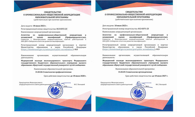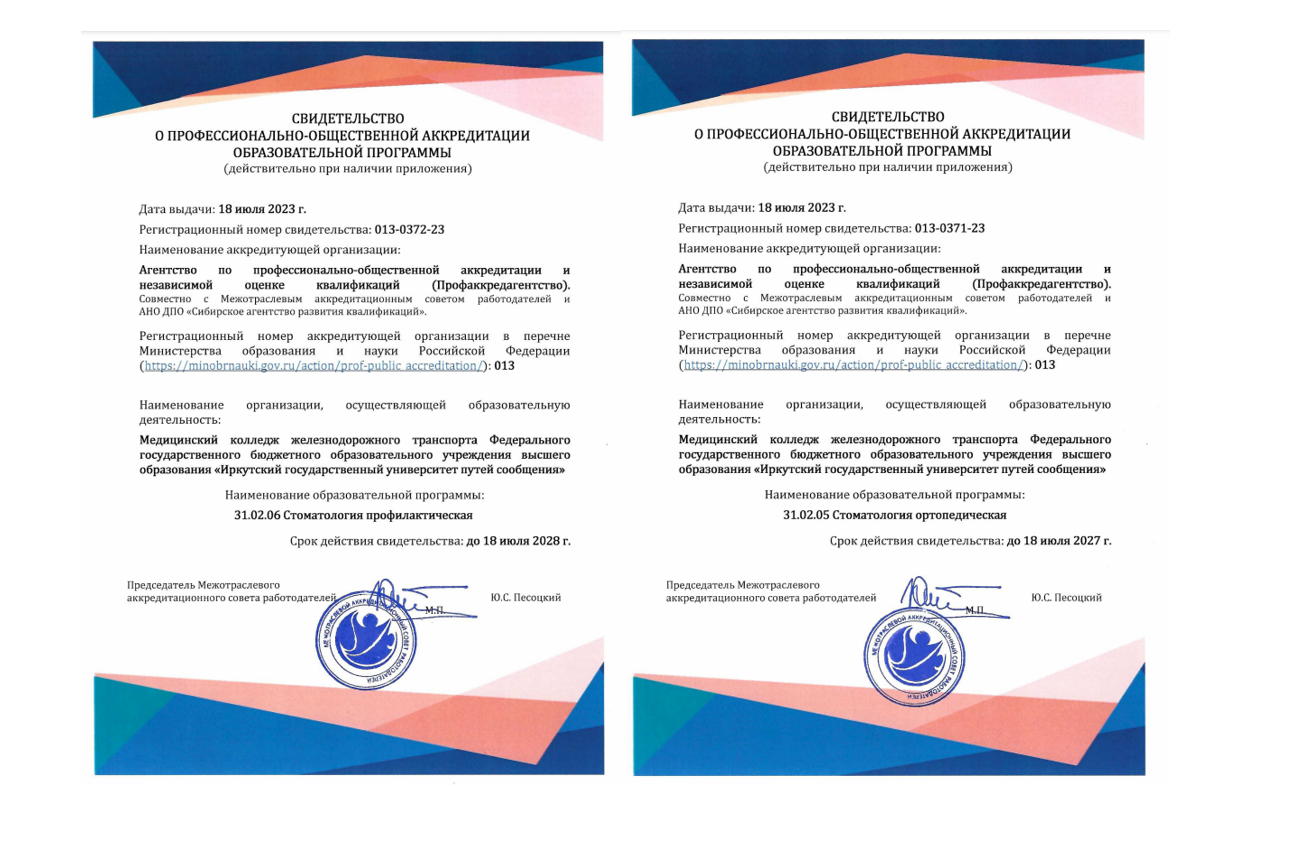 23 августа 2023 года директор Сибирского агентства развития квалификаций Елена Владимировна Филиппова вручила директору МК ЖТ ИрГУПС Людмиле Сергеевне Козловой свидетельства о профессионально-общественной аккредитации сроком 4 года для специальности 31.02.05 Стоматология ортопедическая и 5 лет для специальности 31.02.06 Стоматологии профилактической.
