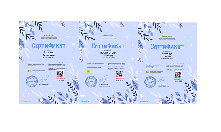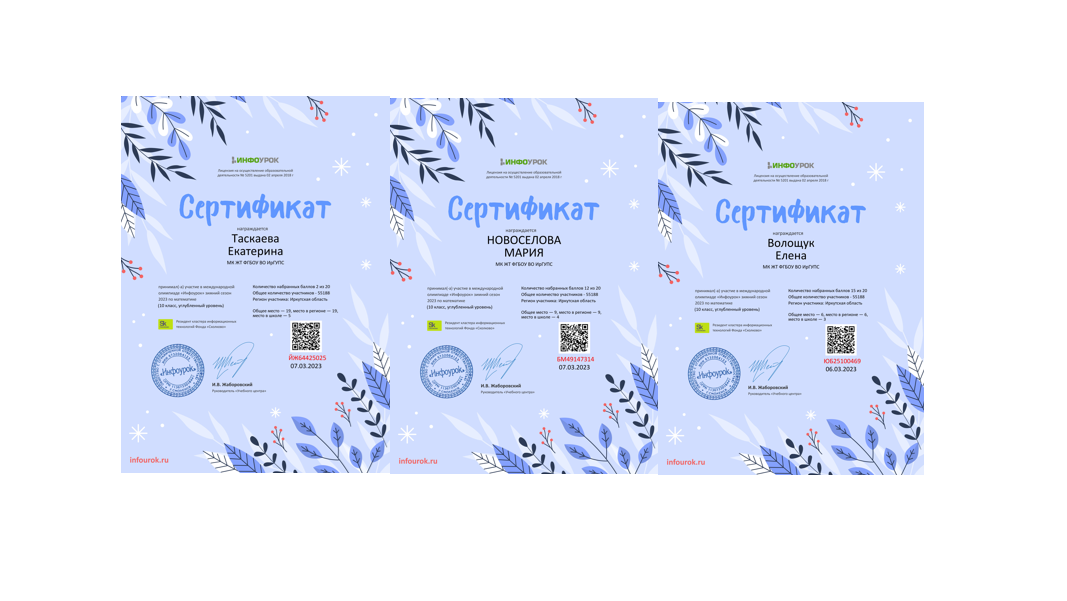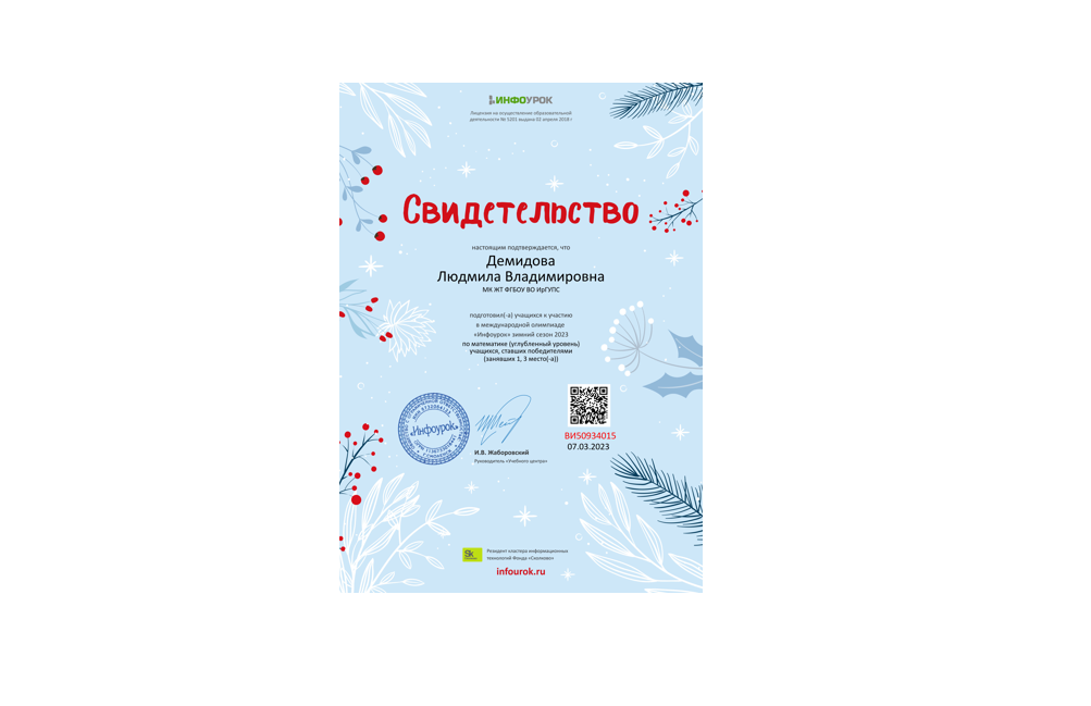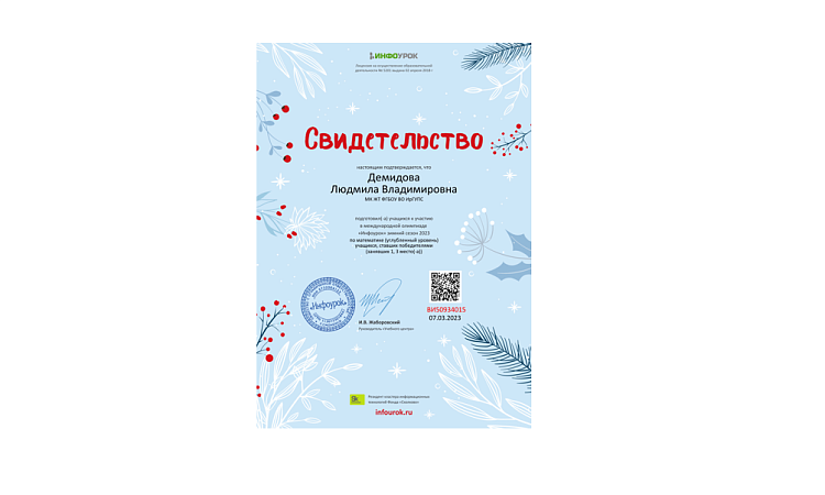 Обучающиеся группы СД.9-22-3(И,О) под руководством преподавателя Демидовой Л. В. приняли участие в Международной олимпиаде "Инфоурок" (зимний сезон 2023) по математике (углубленный уровень).