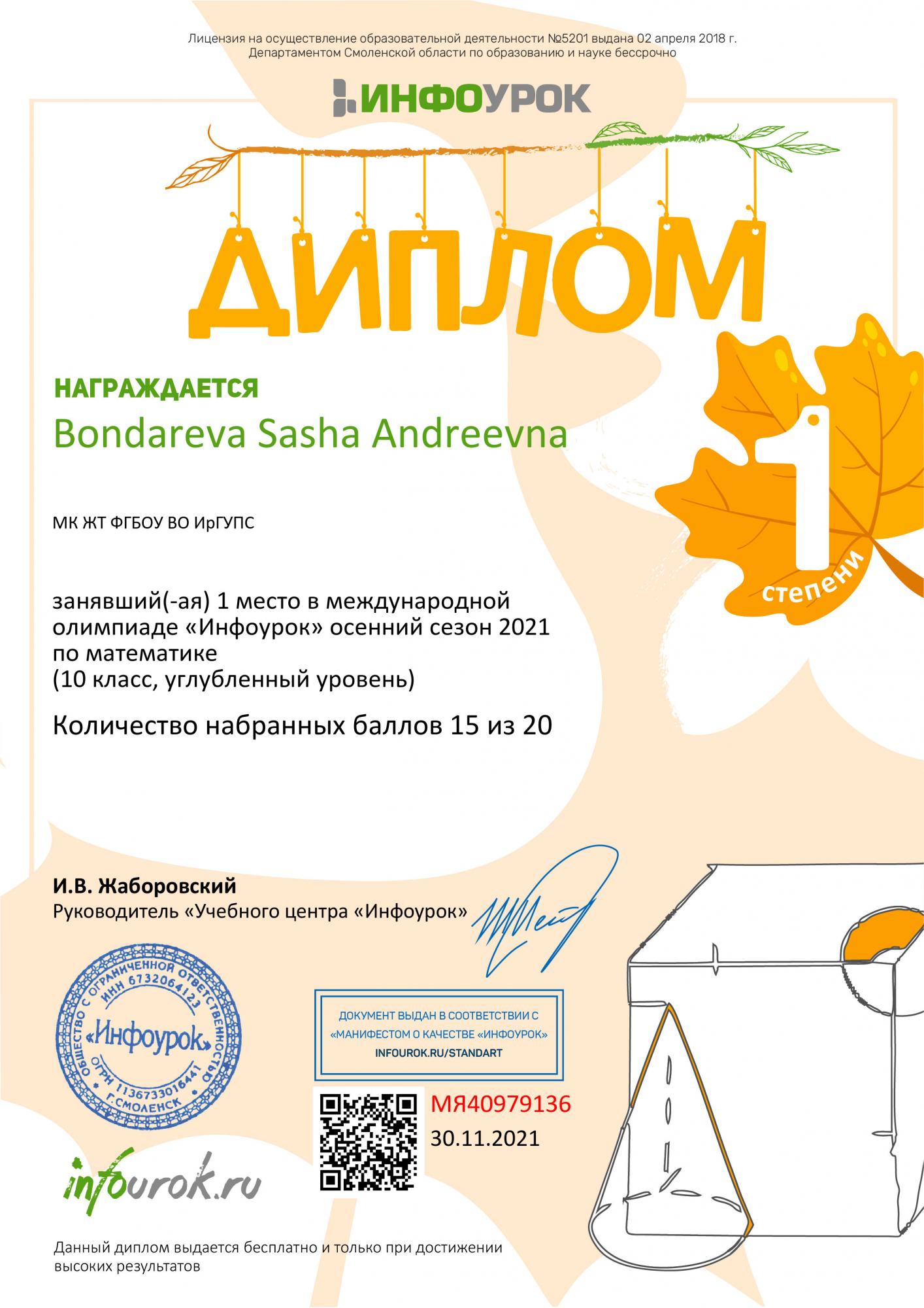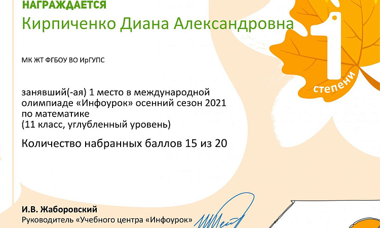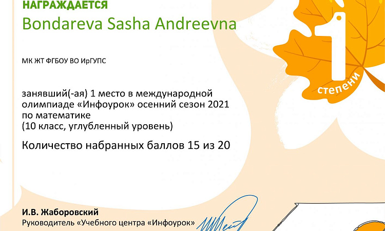В ноябре 29 студентов из групп СО.11-21-1(И,О), СД.11-21-1(И,О), СД.9-21-3(И,О) под руководством преподавателя Демидовой Л. В. приняли участие в международной олимпиаде по математике «Инфоурок».