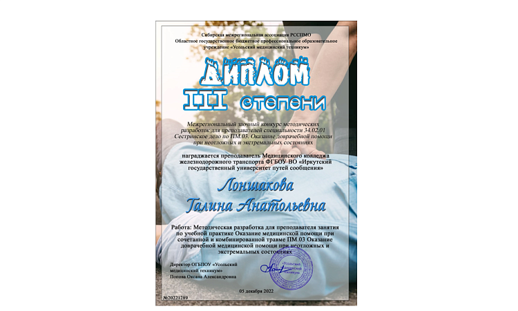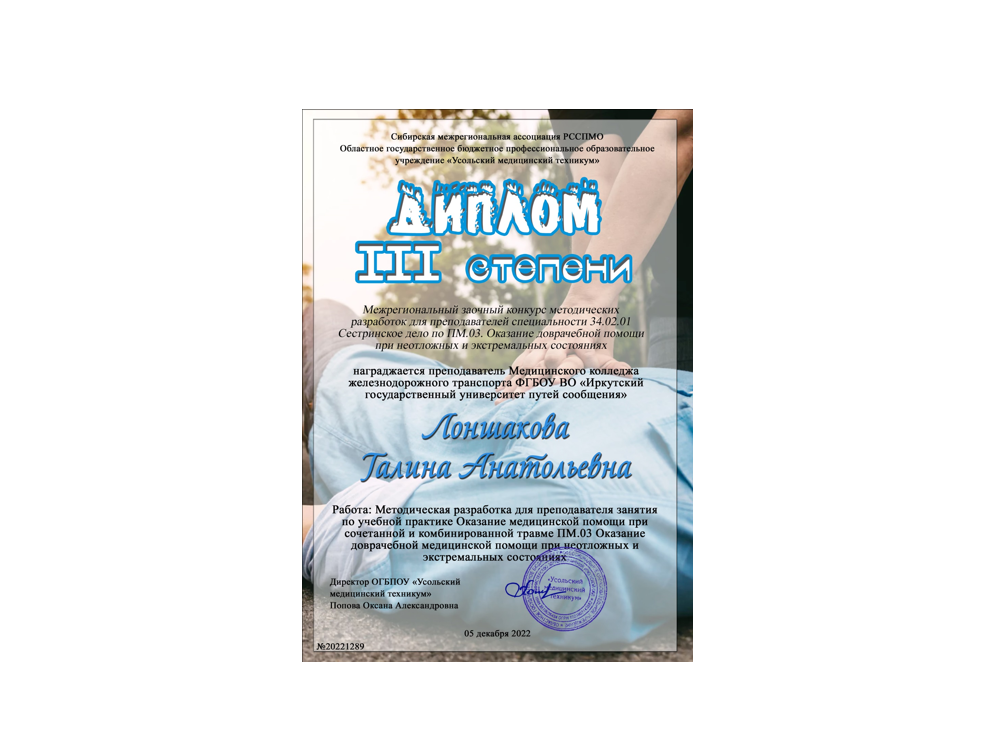 Преподаватели медицинского колледжа ЖТ ИрГУПС Лоншакова Галина Анатольевна и Привалова Ирина Борисовна приняли участие в межрегиональном заочном конкурсе методических разработок для преподавателей специальности 34.02.01 Сестринское дело по ПМ.03. Оказание доврачебной помощи при неотложных и экстремальных состояниях.