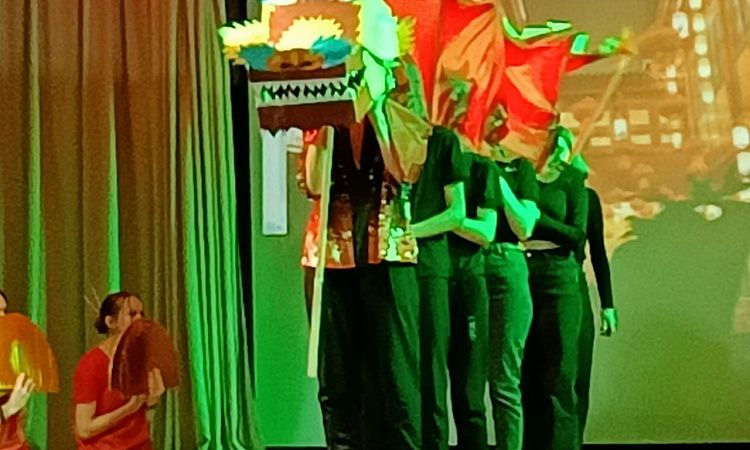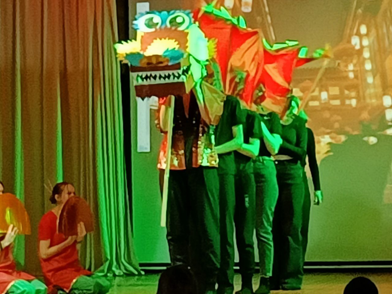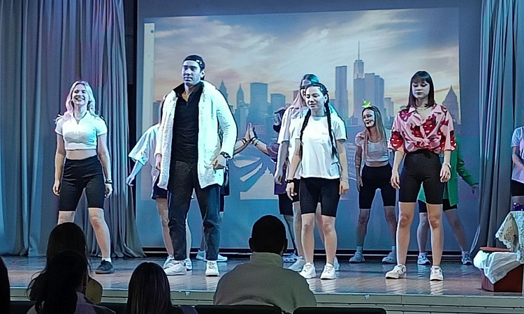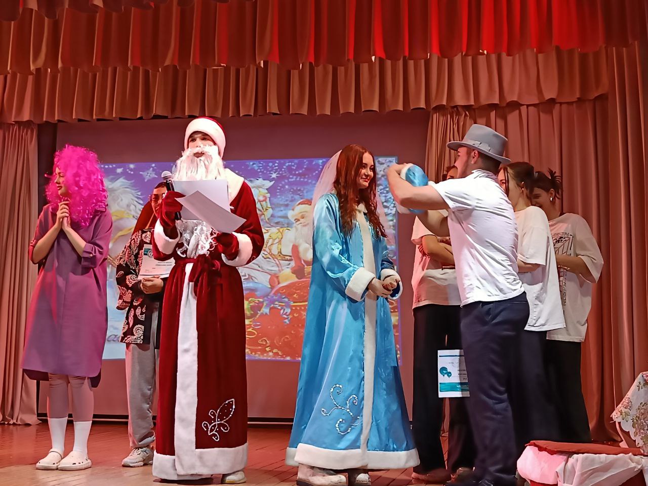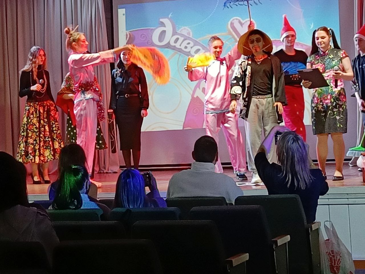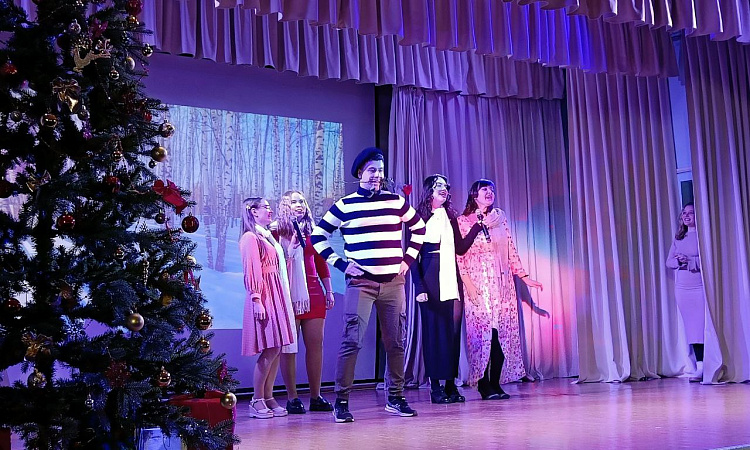 Разноцветные гирлянды, мишура, нарядно украшенная елка – всё это создавало праздничное настроение у зрителей – студентов и гостей.