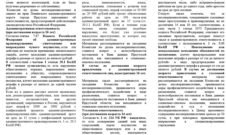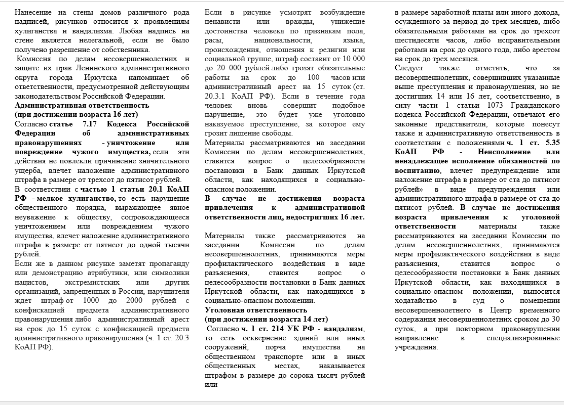 Комиссия по делам несовершеннолетних и защите их прав Ленинского административного округа города Иркутска напоминает об ответственности, предусмотренной действующим законодательством Российской Федерации.
