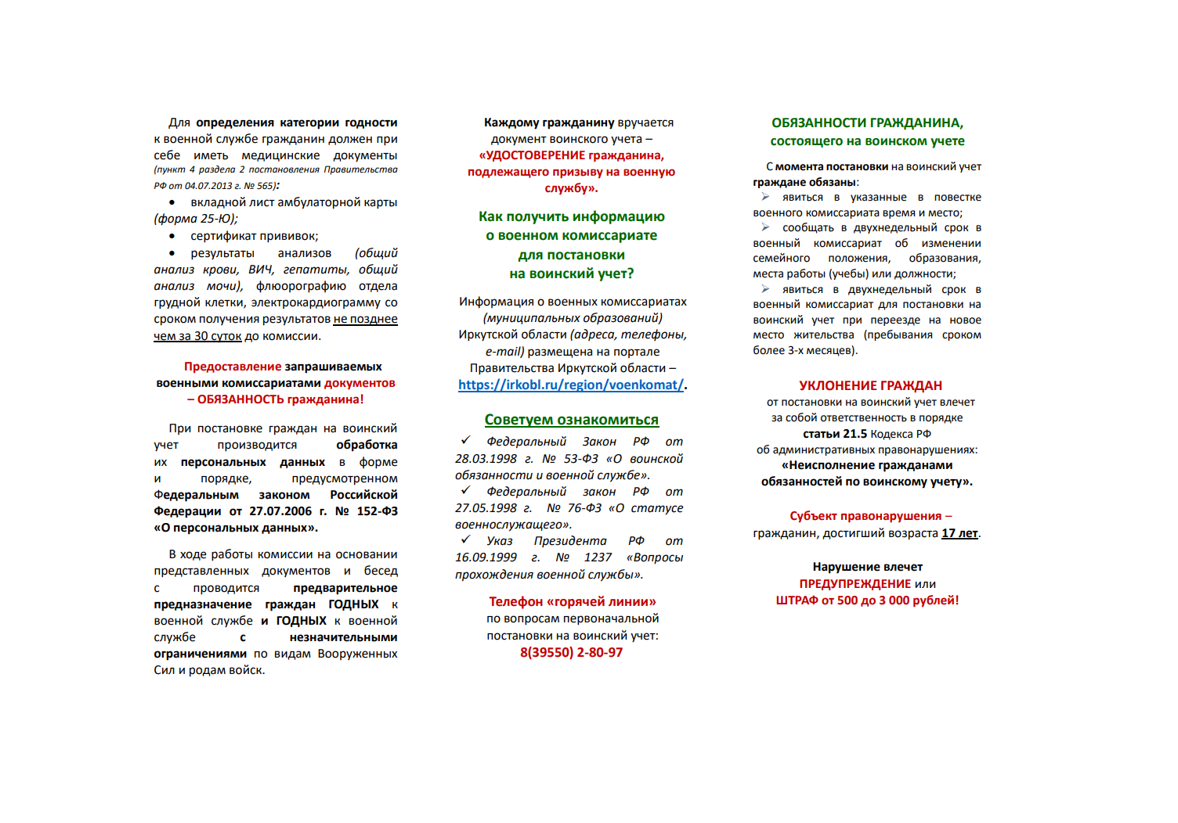 Телефон «горячей линии» по вопросам первоначальной постановки на воинский учет: 8(39550) 2-80-97