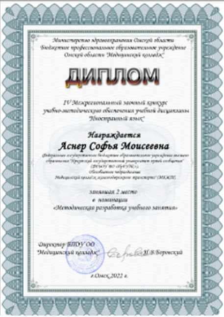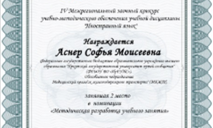 Аснер Софья Моисеевна – IV Межрегиональный заочный конкурс учебно-методического обеспечения учебной дисциплины «Иностранный язык».