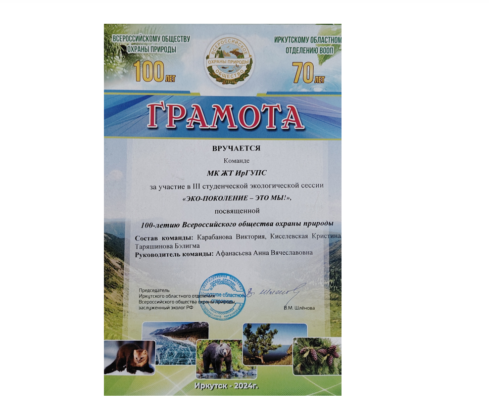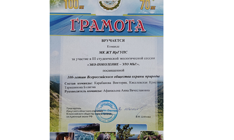 22 ноября Иркутский областной совет Всероссийского общества охраны природы совместно с министерством образования Иркутской области, в рамках просветительского проекта "Экология в моей будущей профессии" на базе гидрометеорологического техникума организовали III студенческую «Экологическую сессию».