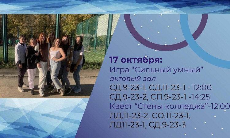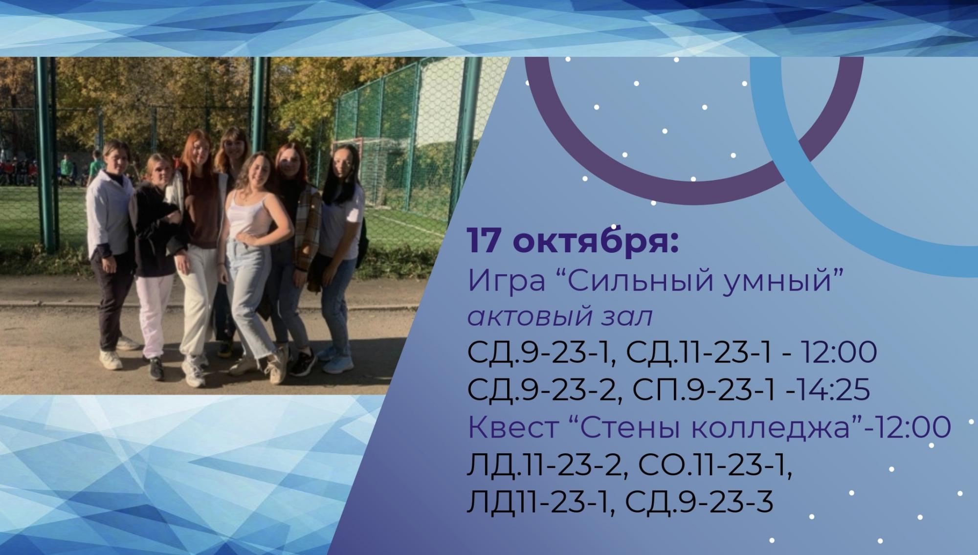 17 октября состоится второй день игры "сильный умный" и квест "стены колледжа" для студентов первого курса.