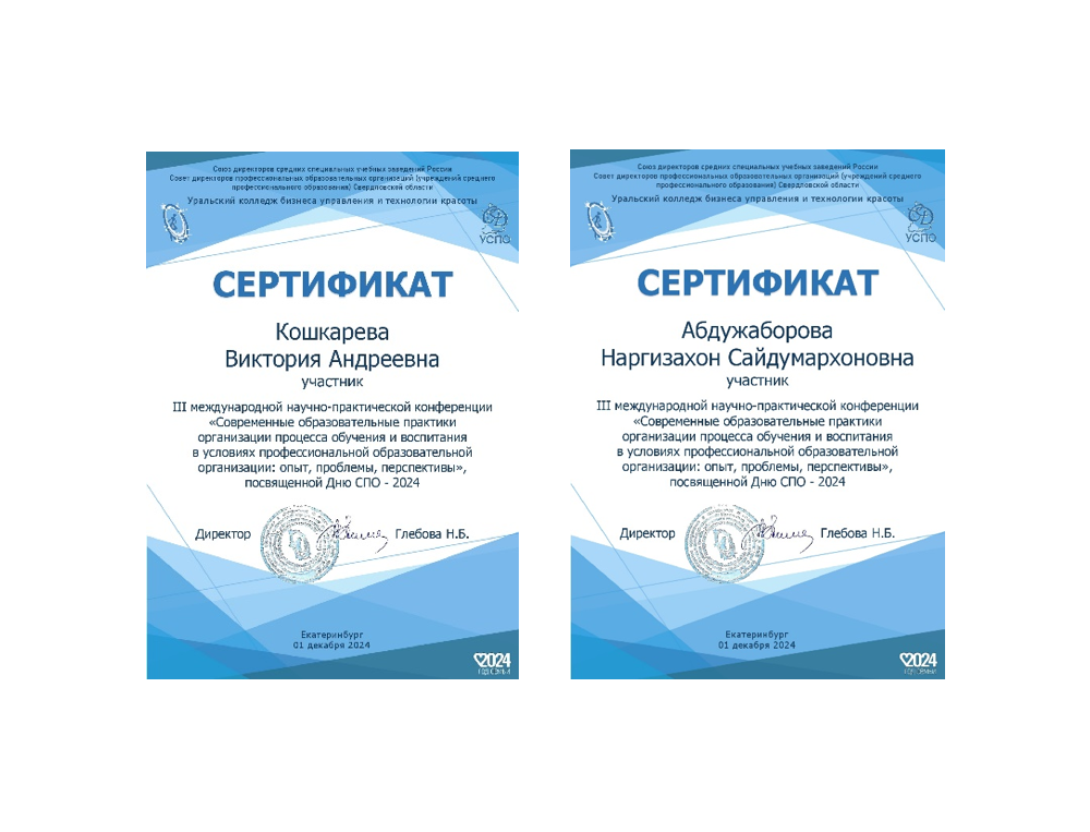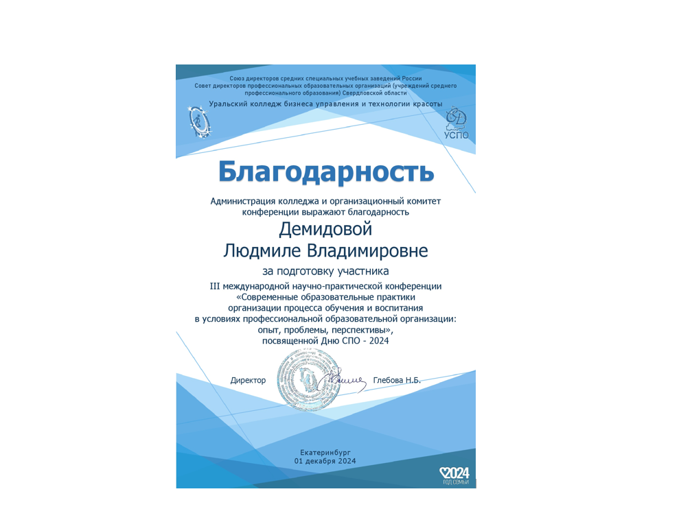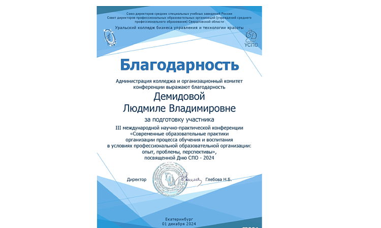 Студенты МК ЖТ ИрГУПС под руководством Демидовой Людмилы Владимировны приняли участие в работе III международной научно-практической конференции «Современные образовательные практики организации процесса обучения и воспитания в условиях профессиональной образовательной организации: опыт, проблемы, перспективы», и в конкурсе презентаций, организованным ГАПОУ Свердловской области «Уральский колледж бизнеса, управления и технологии красоты».
