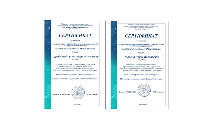 В марте 2024 года студенты МК ЖТ ИрГУПС Арефьева Александра, Бахарева Татьяна, Кудрина Анастасия и Фалюш Дарья под руководством преподавателей Демидовой Л. В., Скольниковой Г. А., Зверевой Н. А. приняли участие в межрегиональной заочной научно-исследовательской конференции обучающихся «Медицина. Здоровье. Образование», организованной ОГБПОУ «Братский медицинский колледж».