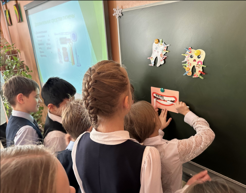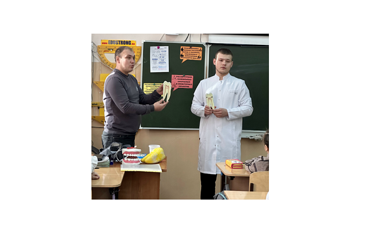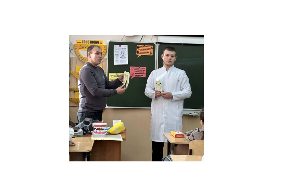 Студенты напомнили школьникам строение и функцию зуба, продемонстрировали как нужно чистить зубы и язык, многие ребята сами попробовали показать освоенную методику стандартного метода чистки зубов на макете. Подошли к рассуждению о том, зачем нам зубы, как важно правильно ухаживать за полостью рта, что вредно для них и что такое кариес, а так же поговорили и акцентировали внимание на осложнениях вовремя не вылеченного кариеса.