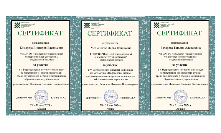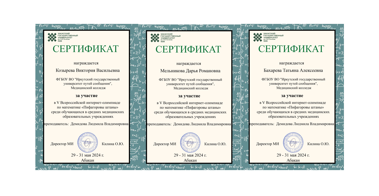 Студенты медицинского колледжа ЖТ ИрГУПС группы СД.9-23-2(ИО) под руководством преподавателя Демидовой Л. В. приняли участие в V Всероссийской Интернет-олимпиаде по Математике «Пифагоровы штаны», посвященной 90-летию организации медицинского училища в г. Абакане.