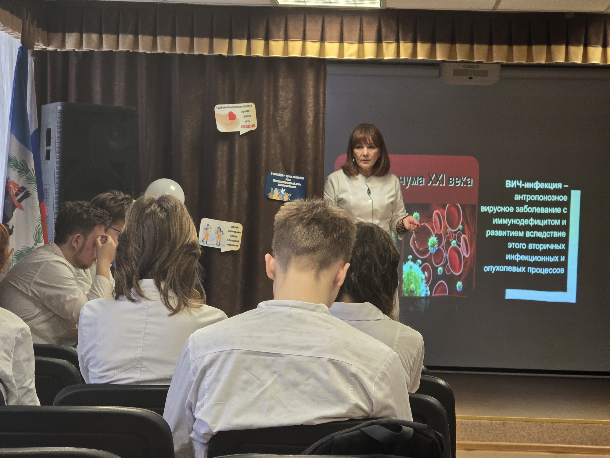 - лекция-презентация «Что нужно знать про ВИЧ?», в которой представлена информация по базовым понятиям про ВИЧ, информационное сообщение об эпидемиологической обстановке по заболеваемости ВИЧ-инфекцией в Иркутской области на 1.10.2024г. по данным центра «СПИД», результаты тестирования студентов колледжа начальных курсов на компетентность по профилактике ВИЧ-инфекции; представлены выписка из реальной истории болезни ВИЧ-инфицированного;