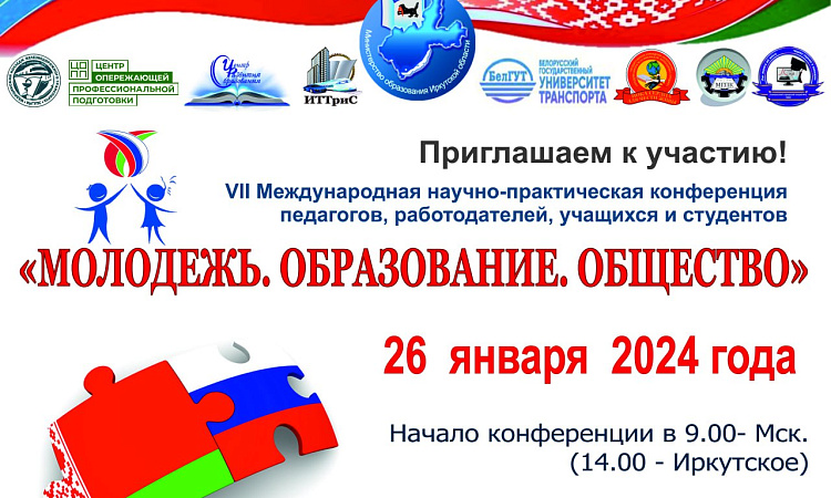 Муниципальное образовательное учреждение дополнительного профессионального образования «Центр развития образования города Саянска» Иркутской области приглашает на VII международную научно-практическую конференцию обучающихся, педагогов, наставников «Молодежь. Образование. Общество» .