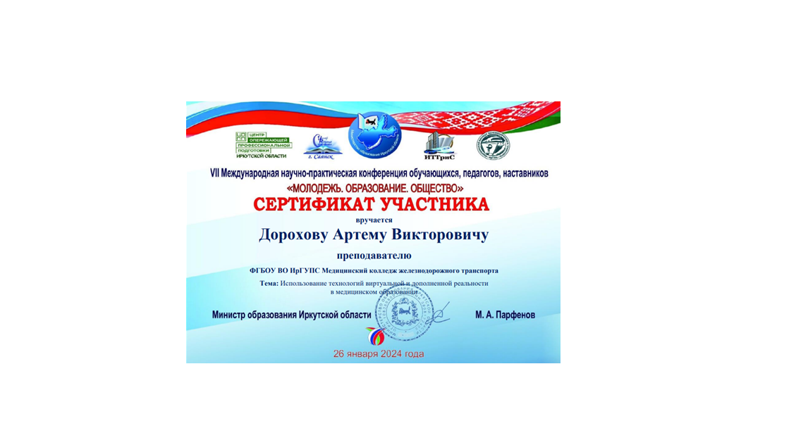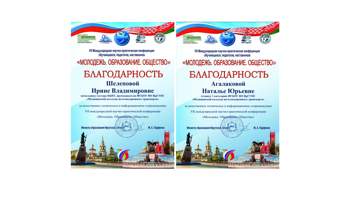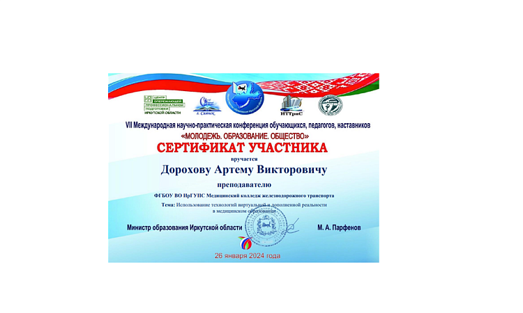 В соответствии с планом основных мероприятий Министерства образования Иркутской области на 2023-2024 учебный год с учетом Плана мероприятий по реализации Соглашения между Правительством Иркутской области (Российская Федерация) и Правительством Республики Беларусь о торгово-экономическом, научно-техническом, культурном и гуманитарном сотрудничестве на 2023-2025 годы (утв. губернатором Иркутской области 07.12.2022г.) 26 января 2024 года прошла VII Международная научно-практическая конференция педагогов, работодателей, обучающихся «МОЛОДЕЖЬ. ОБРАЗОВАНИЕ. ОБЩЕСТВО».
