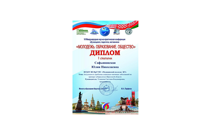 Сафьяновская Юлия с темой «Актуальность проблемы социально - значимых заболеваний на примере туберкулеза в Иркутской области», Медицинский колледж ЖТ ИрГУПС.