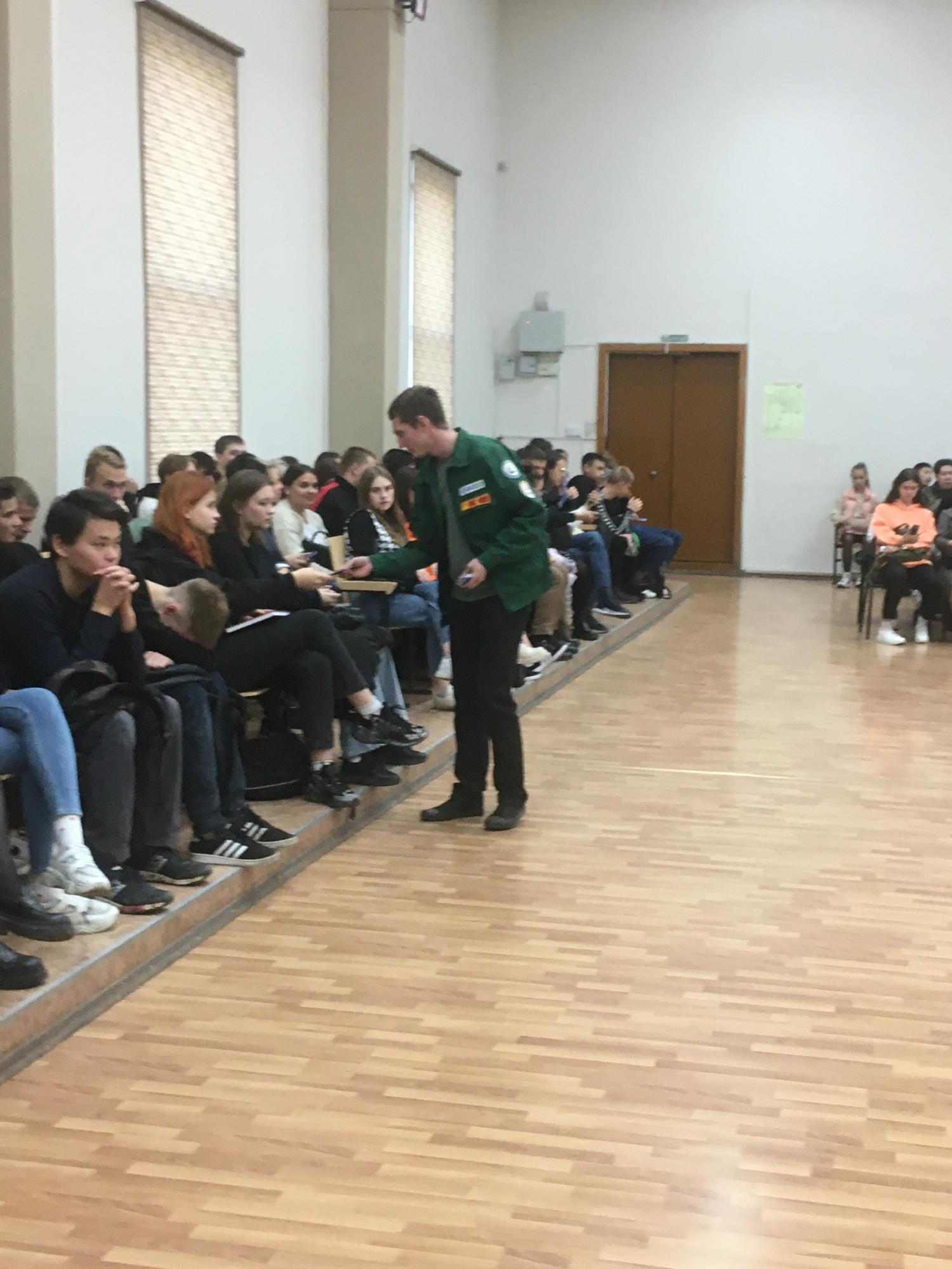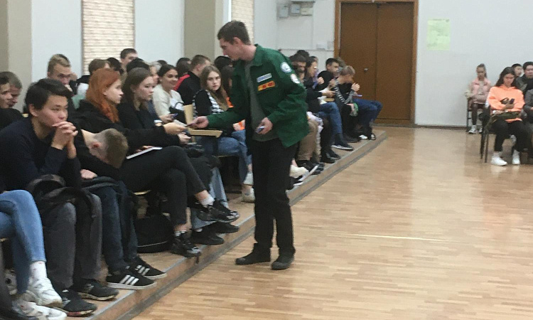 Вторая часть занятия была посвящена, по традиции, знакомству с возможностями, которые предоставлены нашим студентам, имеющим активную гражданскую позицию. В это раз гостем стала командир штаба Байкальского студенческого строительного отряда Куликова Екатерина. Она познакомила ребят с деятельностью стройотряда, о тех объектах, на которых работают студенты, об интересной и насыщенной жизни «стройотрядовцев».