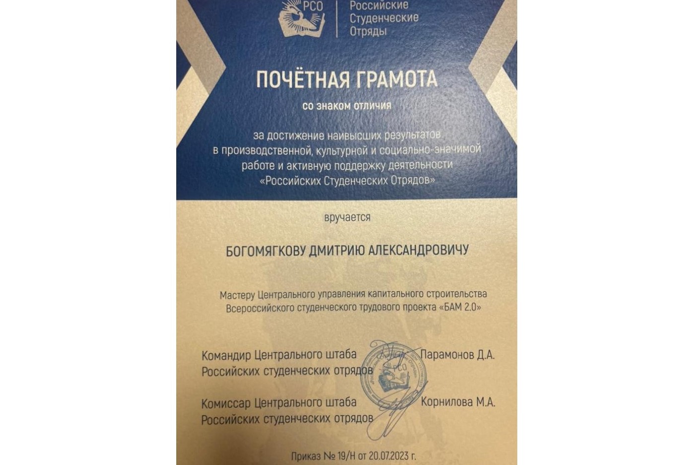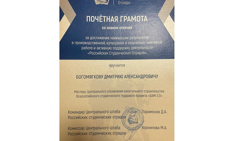 Командир Строительного студенческого отряда «Байкал» СКТиС Дмитрий Богомягков получил Почетную грамоту со знаком отличия за достижение наивысших результатов в производственной, культурной и социально-значимой работе и активную поддержку деятельности «Российских студенческих отрядов»
