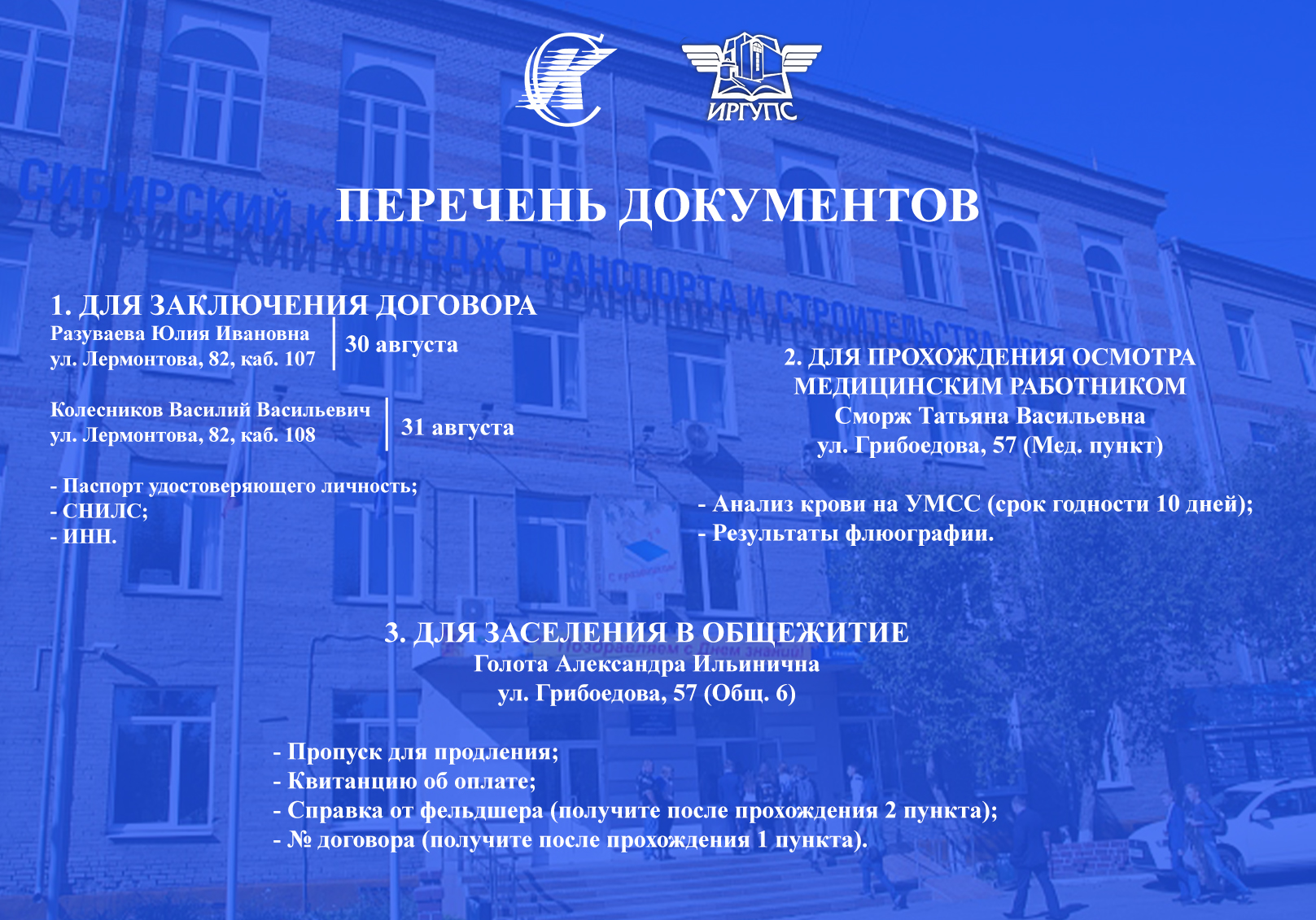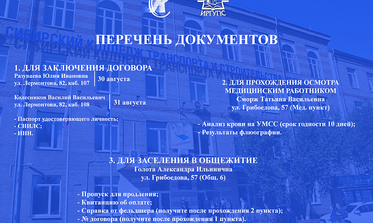 ИНФОРМАЦИЯ ПО ЗАСЕЛЕНИЮ В ОБЩЕЖИТИЕ ДЛЯ СТУДЕНТОВ 2,3,4 КУРСОВ