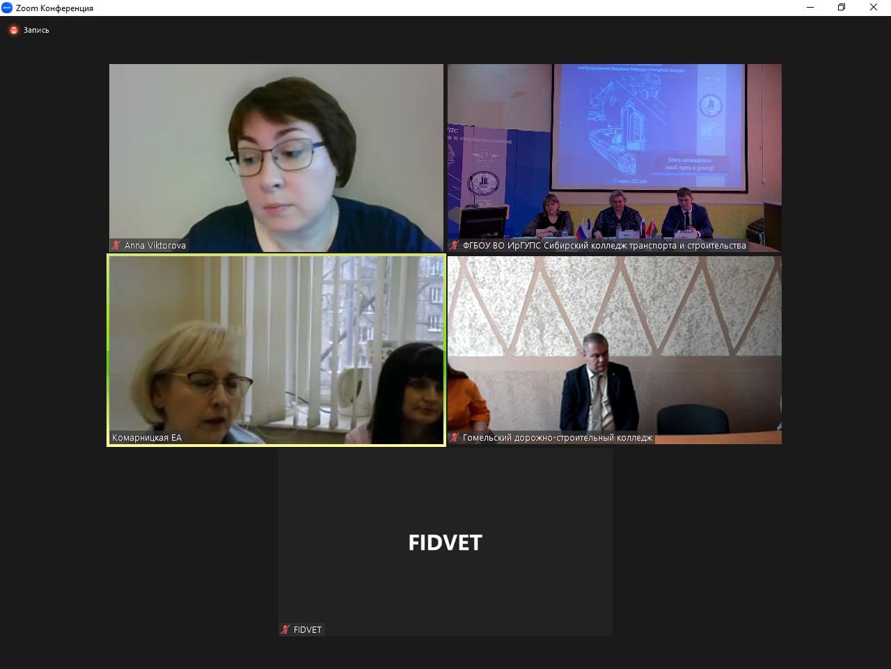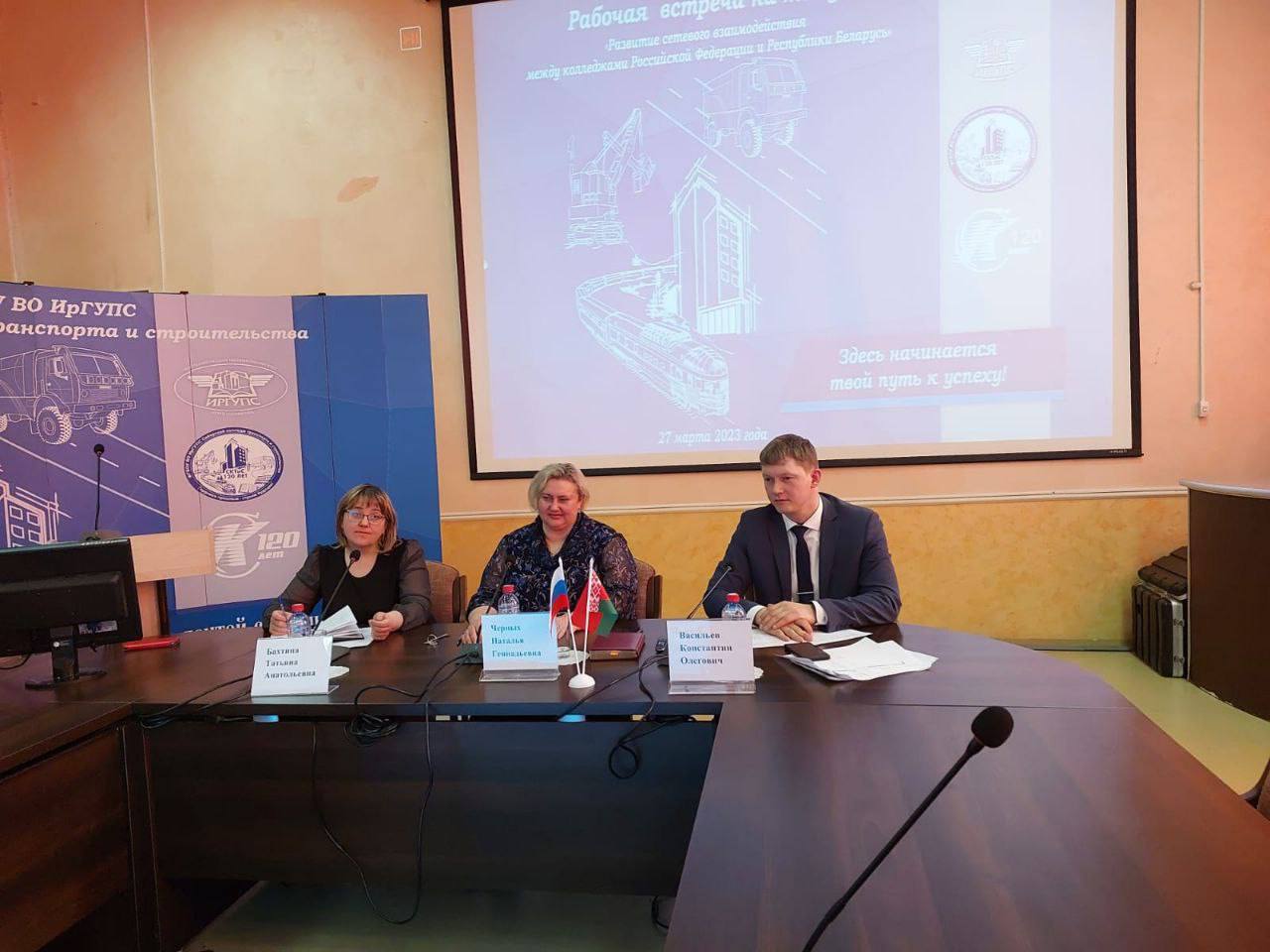 27 марта в колледже в формате ВКС состоялась рабочая встреча между ФГБОУ ДПО "Институт развития профессионального образования" (г. Москва), Сибирским колледжем транспорта и строительства ФГБОУ ВО "Иркутский государственный университет путей сообщения" и Филиалом "Гомельский государственный дорожно-строительный колледж имени Ленинского комсомола Белоруссии" (г. Гомель, Республика Беларусь)
