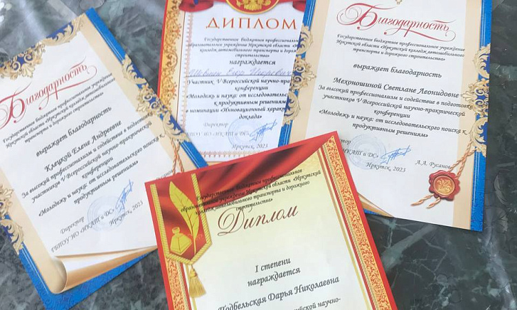20 апреля преподаватели Клецкая Е.А, Мехоношина С.Л и Подбельская Д.Н со студентами Команденко Алиной и Шевниным Егором участвовали во Всероссийской научно практической конференции в Иркутском колледже автомобильного транспорта и дорожного строительства