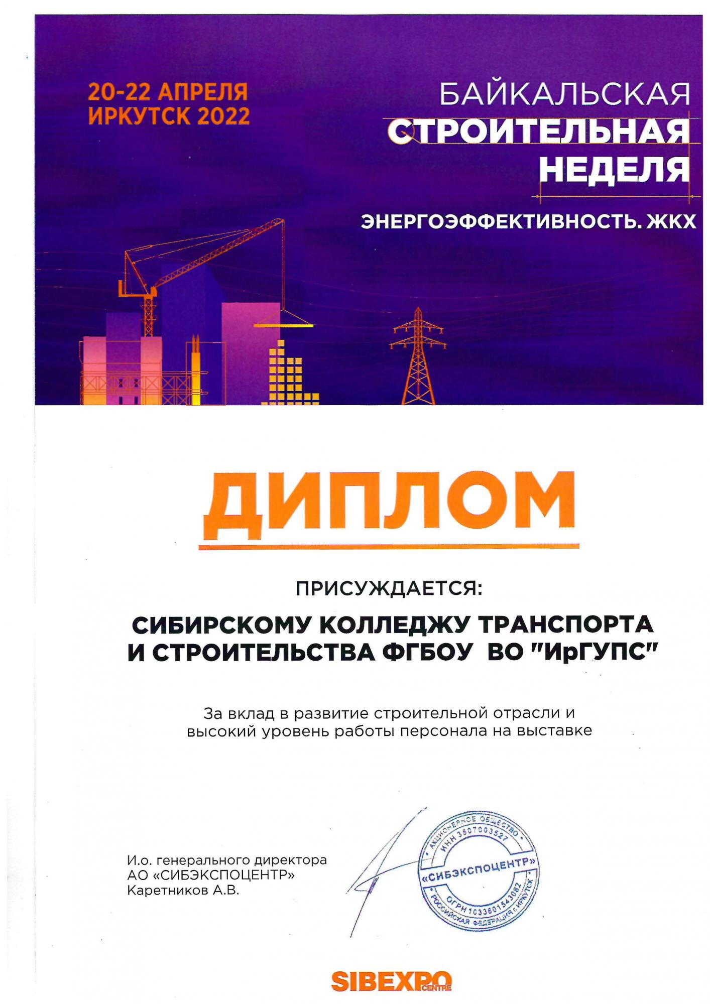 22 апреля завершила свою работу выставка «Байкальская строительная неделя». За период работы выставку нашего колледжа посетили более 670 человек, потенциальных абитуриентов. Большой интерес вызвали специальности, по которым ведется обучение в колледже. Все участники получили буклеты об условиях набора на 2022-2023 учебный год, а также имели возможность лично задать вопросы преподавателям, специалистам и студентам колледжа. По итогам работы делегация колледжа получила благодарственное письмо организаторов выставки.