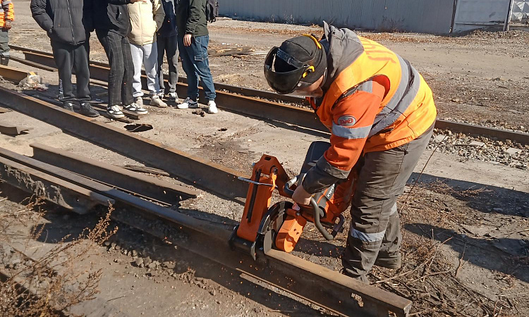 После инструктажа по охране труда, технике безопасности и безопасности производства путевых работ участники мастер-класса вышли на перегон, где их уже ждали путейская бригада с интересными заданиями. Первым этапом занятия стало обследование стрелочного перевода с применением путевого шаблона, штангенциркуля и шаблона КОР. Будущие инженеры-строители проверяли ширину колеи, положение рельсовых нитей по уровню, критические расстояния в крестовине, шаг остряка, желоба, зазоры, ступеньки в рельсовых стыках и др. После всех измерений соответствующие записи были занесены в Книгу записи результатов проверки стрелочных переводов и глухих пересечений (Формы ПУ-29). Дальнейший план мероприятия предполагал проведение работ по выправке пути укладкой пучинных карточек. Студенты познакомились с критериями назначения этой работы, правилами безопасного ее проведения, инструментом и технологией. Самым отважным доверили забивать костыли после укладки карточек. В финальной части занятия состоялось знакомство с новым рельсорезным станком РР-80. Монтеры пути продемонстрировали скорость резки рельсов и качество реза. После полевых работ состоялось заседание с обсуждением норм по смене шпал, выправке пути и других работ выполняемых монтерами пути за один день.