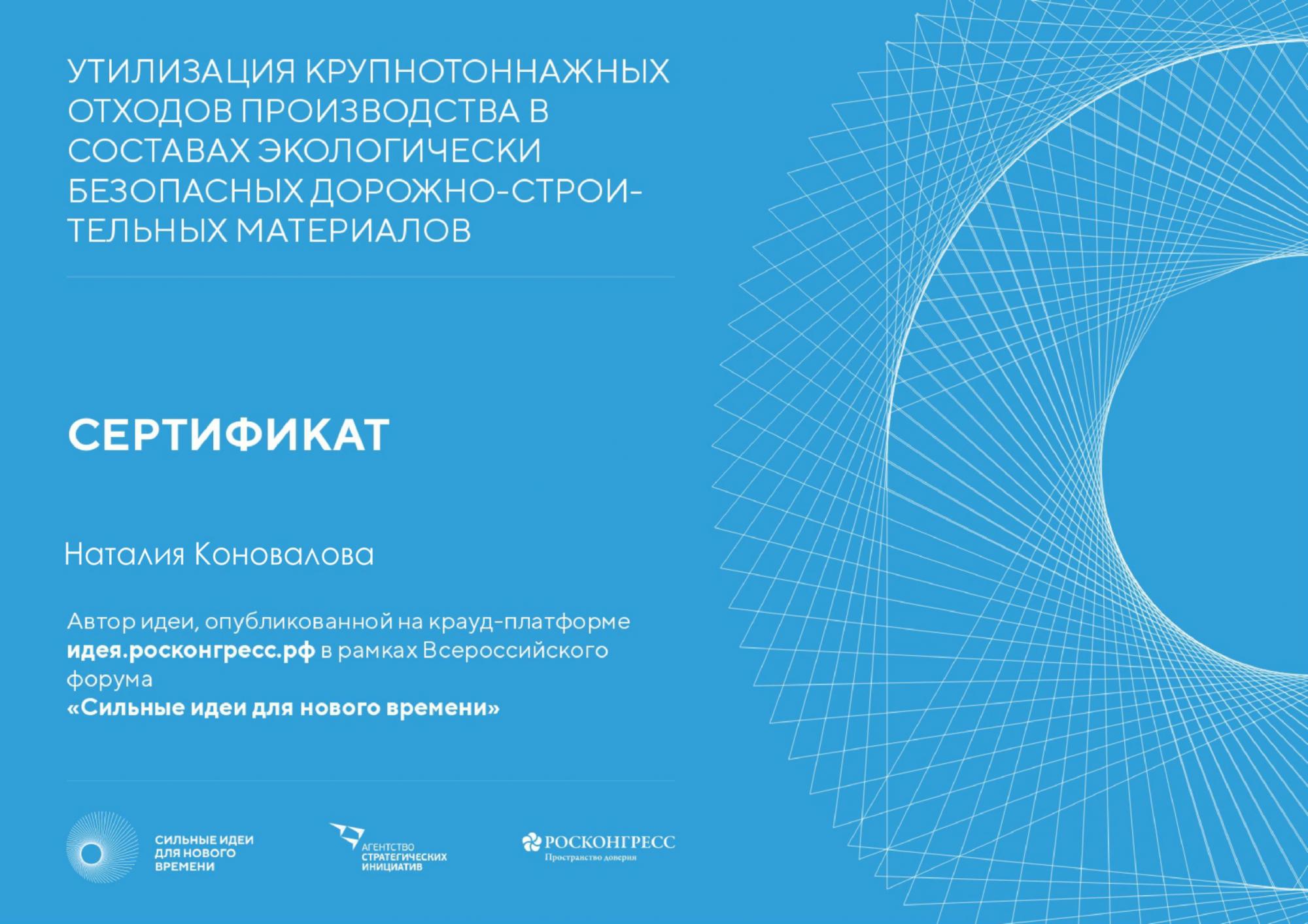По итогам конкурсного отбора проект «Утилизация крупнотоннажных отходов производства в составах экологически безопасных дорожно-строительных материалов» прошел в ТОП-1000. Поздравляем Наталию Коновалову и членов научного коллектива!