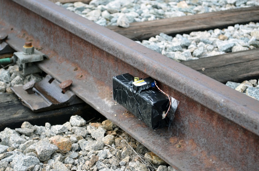 На фото 1 - взрывное устройство, установленное условным противником на железнодорожных путях с целью совершения диверсионного акта.
