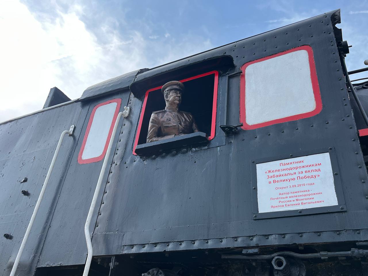 Памятник был установлен в 2010 году по инициативе главы Думы Читы, почетного железнодорожника России и Монголии Евгения Ярилова. В его создании участвовали более 130 работников железной дороги. В этом году Председатель городской Думы предложил дополнить паровоз скульптурой машиниста, олицетворяющей людей, которые трудились на железной дороге во время войн. Обновлен памятник «Железнодорожникам Забайкалья за вклад в Великую Победу»