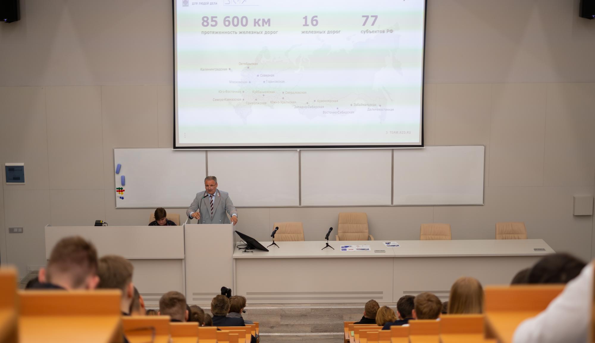 Студентам рассказали о перспективах развития компании ОАО «Российские железные дороги», в частности, о программном развитии человеческого капитала на период до 2025 года, в рамках создания которого были учтены запросы всех заинтересованных сторон: государственных институтов, работников компании, бизнес-подразделений, руководителей и специалистов социально-кадрового блока.