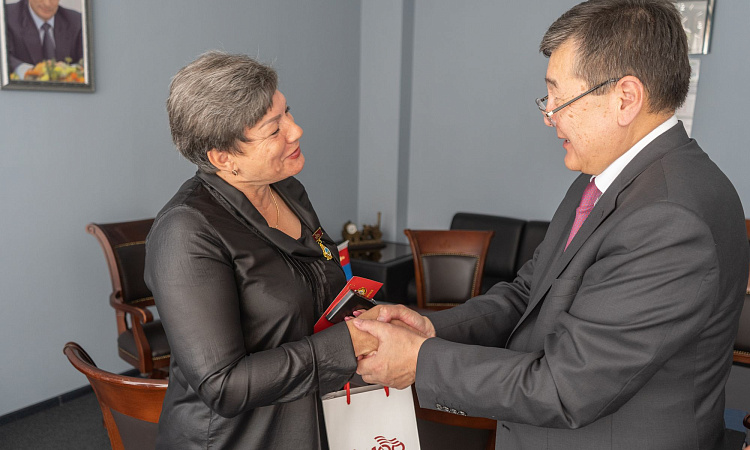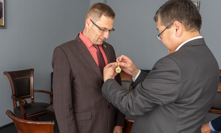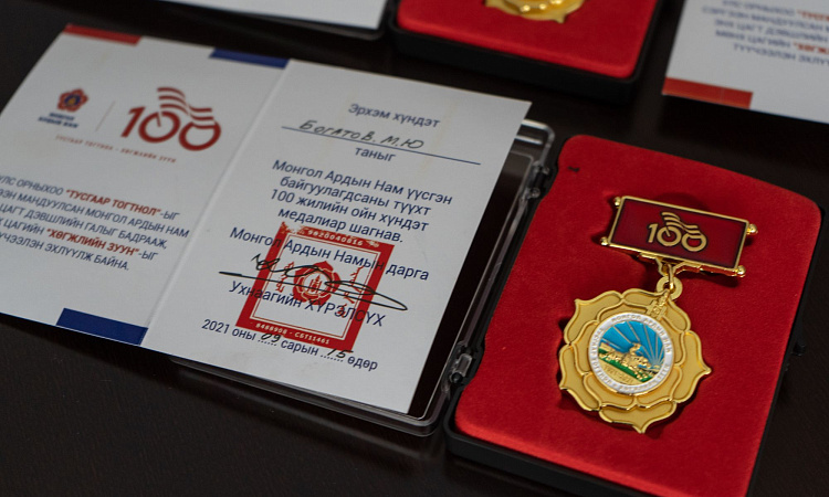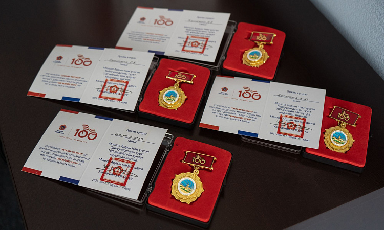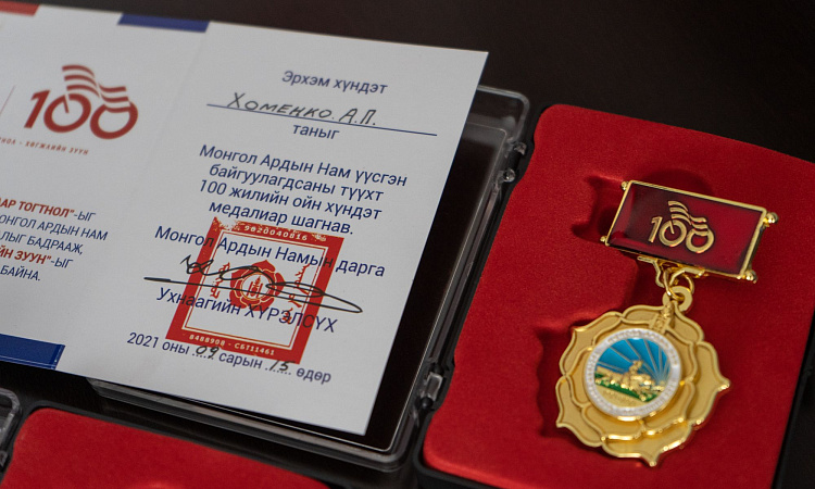В завершении встречи Генеральный консул Монголии в Иркутске Жигмэд Энхжаргал наградил и.о. ректора ИрГУПС Андрея Хоменко, а также проректора по развитию и социальным вопросам Владимира Дорофеева, начальника Управления международного сотрудничества Максима Богатова и управляющую документацией Елену Аношкину медалями в честь 100-летия со дня основания Монгольской народной партии.
