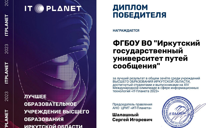 Студенты и выпускники Иркутского государственного университета путей сообщения стали участниками XIV Международной олимпиады в сфере информационных технологий «ИТ-Планета 2023». Соревнования были направлены на популяризацию и развитие ИКТ-решений, а также выявление и поддержку способных и практически подготовленных студентов и молодых специалистов ИТ-сферы.