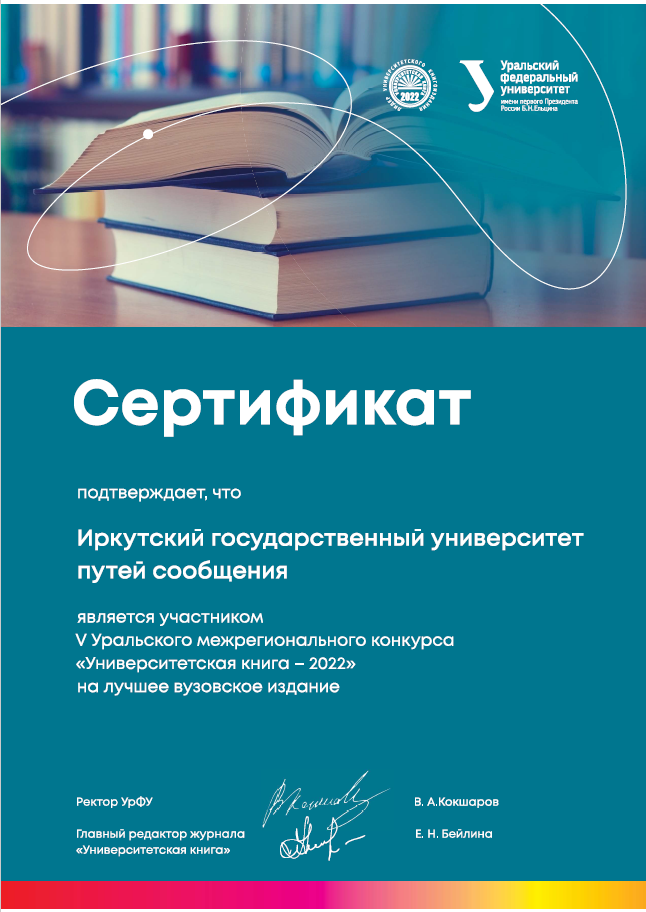 Иркутский государственный университет путей сообщения принял участие в V Уральском межрегиональном конкурсе изданий «Университетская книга» (1 марта – 21 октября 2022 г., ФГАОУ ВО «Уральский федеральный университет имени первого Президента России Б.Н. Ельцина» (УрФУ)).