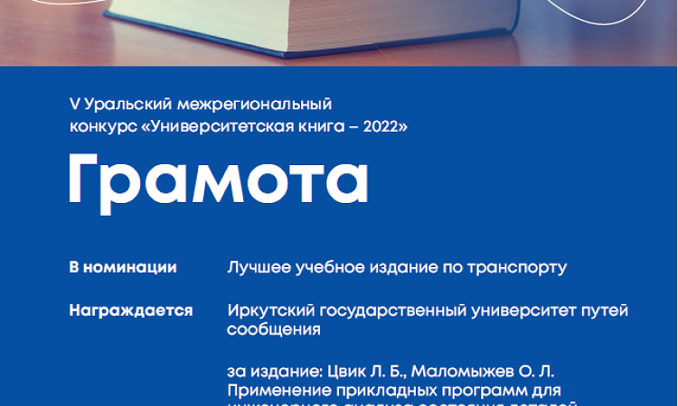 По результатам конкурса учебное издание Применение прикладных программ для инженерного анализа состояния деталей подвижного состава : практикум / Л. Б. Цвик, О. Л. Маломыжев. – Иркутск : ИрГУПС, 2020. – 136 с. признано лучшим в номинации «Лучшее учебное издание по транспорту» и награждено грамотой.