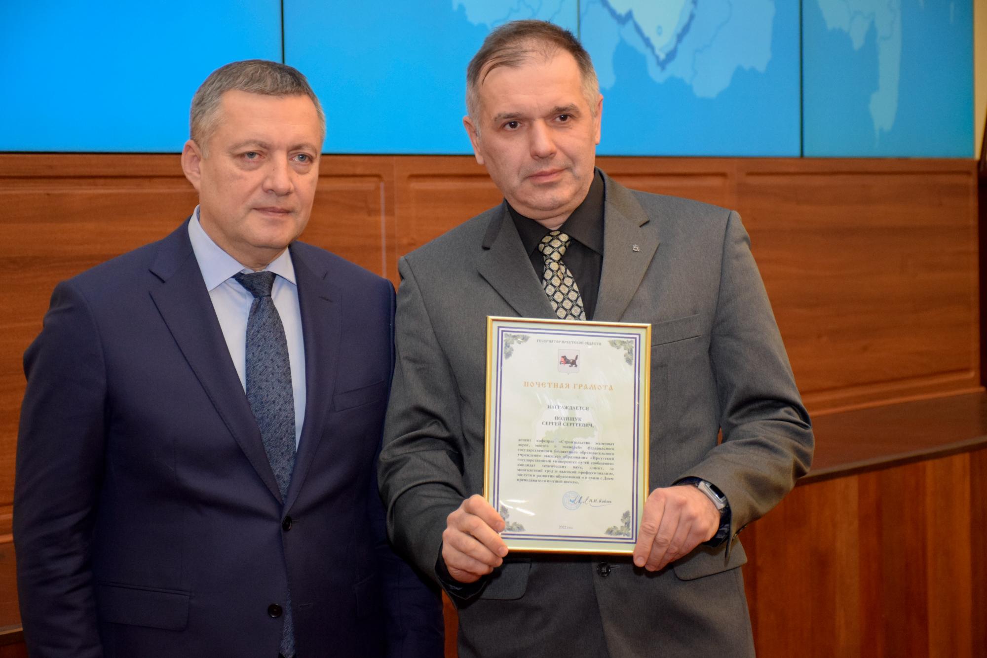 Почетной грамотой Губернатора был награжден Сергей Полищук, доцент кафедры «Строительство железных дорог, мостов и тоннелей» федерального государственного бюджетного образовательного учреждения высшего образования «Иркутский государственный университет путей сообщения» кандидат технических наук, доцент, за многолетний труд и высокий профессионализм, заслуги в развитии образования и в связи с Днем преподавателя высшей школы.