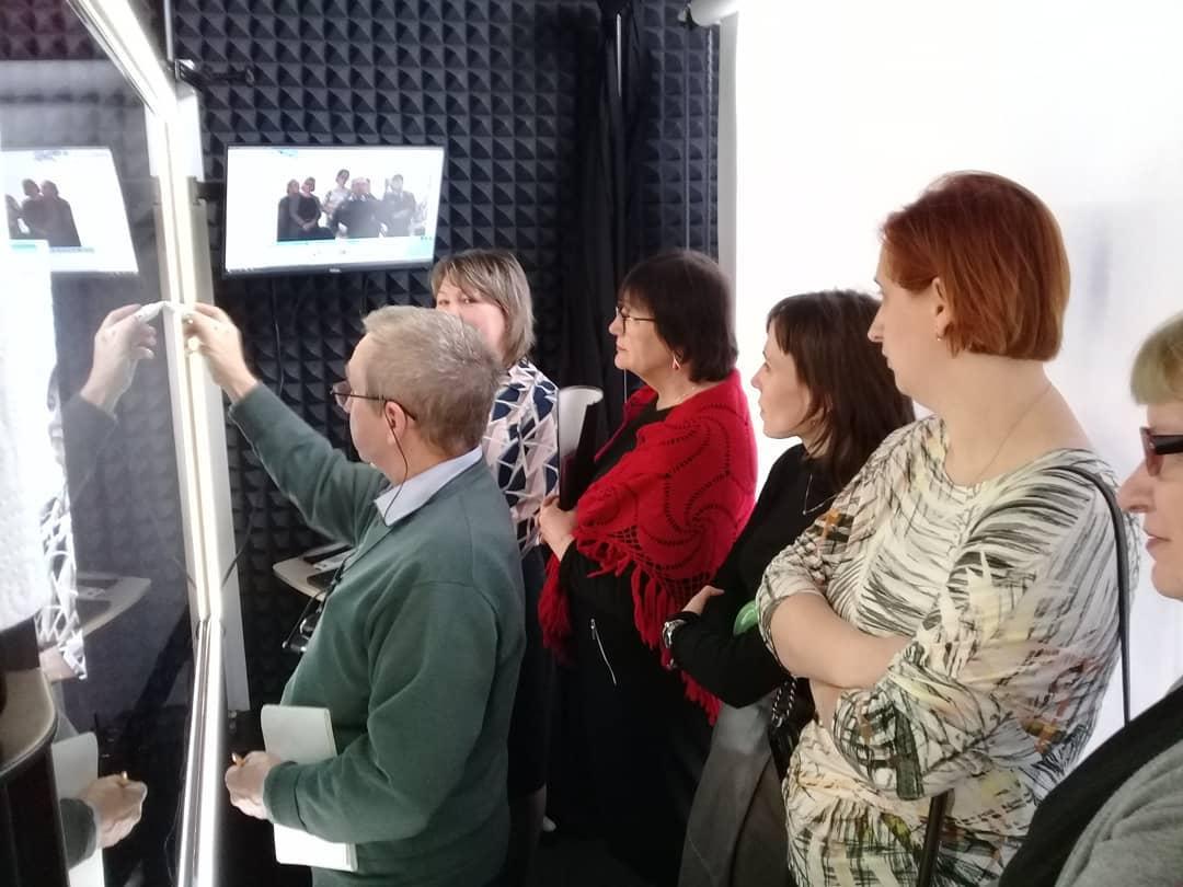 В студии есть все оборудование для комфортной съемки. В том числе, интерактивная стеклянная доска, на которой лектор во время записи может писать, стирать, выделять, рисовать. Словом делать то, что разнообразит визуальный и графический видеоряд и привлечет внимание к теме курса. А полная изоляция преподавателя от внешнего мира во время записи несет важный психологический момент. Прямой контакт с камерой помогает не отвлекаться и не стесняться посторонних. Все, что требуется от педагогов - просто и интересно рассказывать о своем предмете.