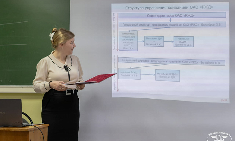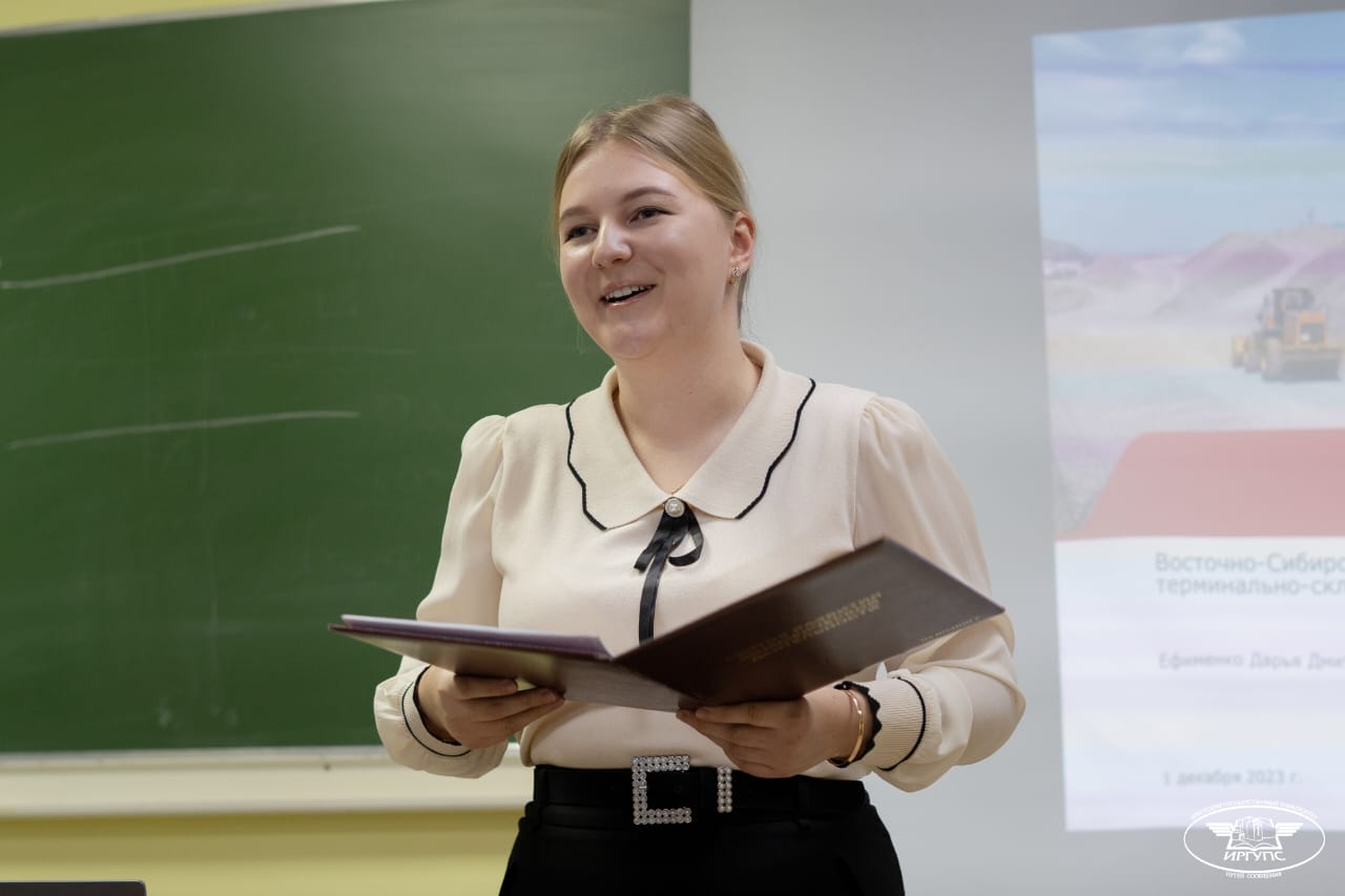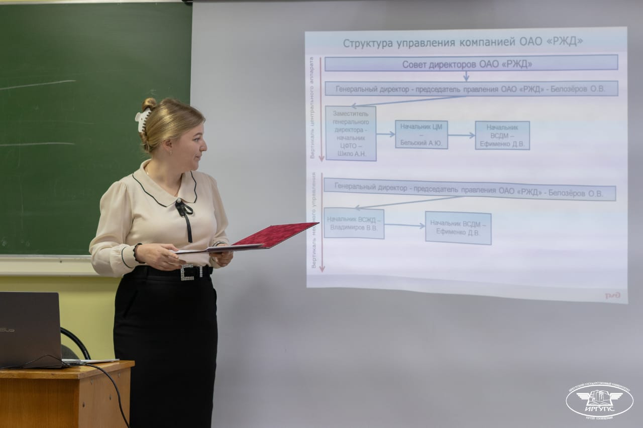 Дарья Дмитриевна рассказала студентам 4 курса, обучающихся по специальностям Эксплуатация железных дорог, Магистральный транспорт и Грузовая и коммерческая работа об инновационных подходах в области предоставления транспортно-экспедиционных услуг Восточно-Сибирской дирекцией по управлению терминально-складским комплексом.