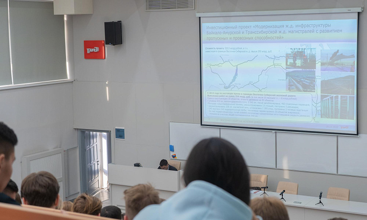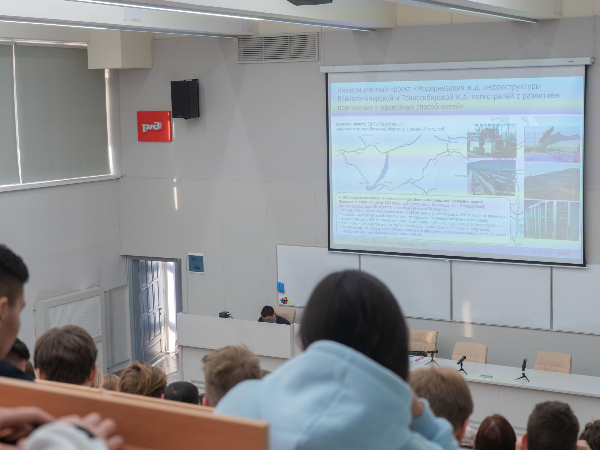 Студентам рассказали о задачах по строительству объектов железнодорожной инфраструктуры на Восточном полигоне и масштабной реконструкции. В частности, представили проекты ОАО "РЖД" "Транссиб за 7 суток", "БАМ-2" и комплексный план модернизации и расширения магистральной инфраструктуры на период до 2024 года.