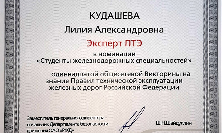 Второкурсница Иркутского государственного университета путей сообщения специальности «Эксплуатация железных дорог» Лилия Кудашева стала частью финала масштабной Викторины на знание ПТЭ.