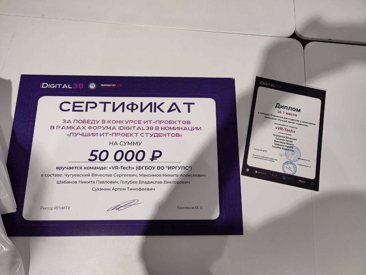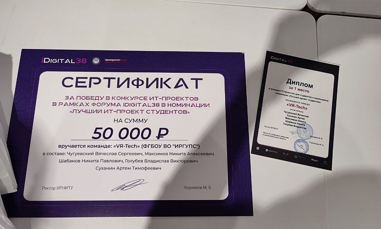 По результатам проект команды ИрГУПС «ВиАр-тренажер по изучению конструкции и неисправностей контактной сети железных дорог» одержал победу, получив денежный сертификат на сумму 50 тысяч рублей.