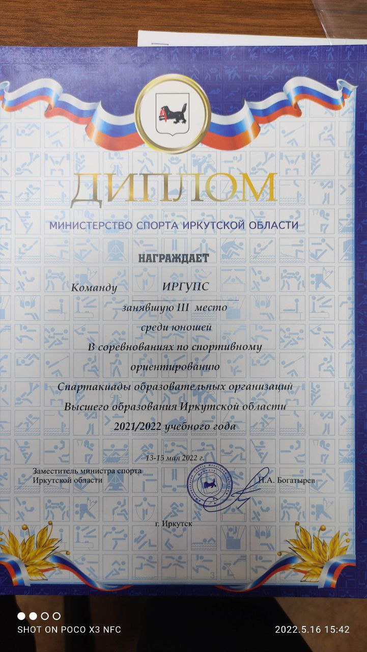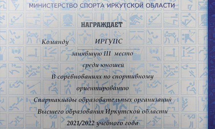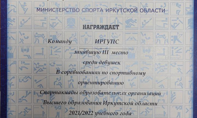 Также команда Иркутского государственного университета заняла III место среди девушек и юношей в соревнованиях по спортивному ориентированию Спартакиады образовательных организаций Высшего образования Иркутской области 2021-2022 года.