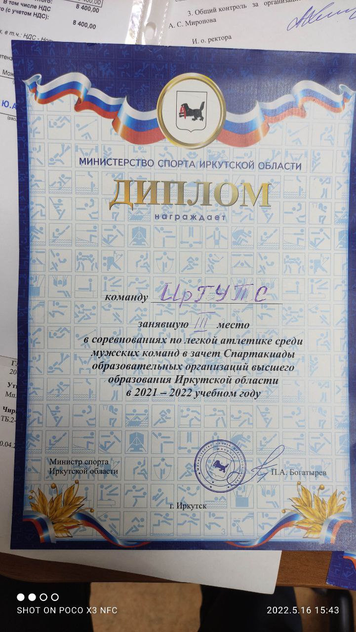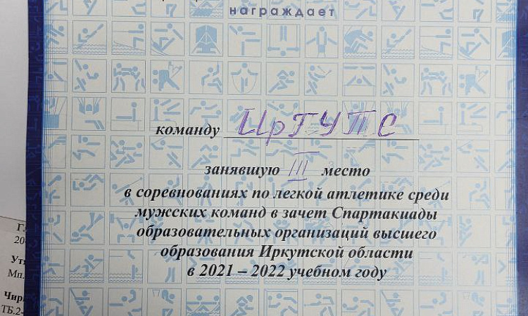 Команда Иркутского государственного университета путей сообщения заняла III место в соревнованиях по легкой атлетике среди мужских команд в зачете Спартакиады образовательных организаций высшего образования Иркутской области в 2021-2022 учебном году.