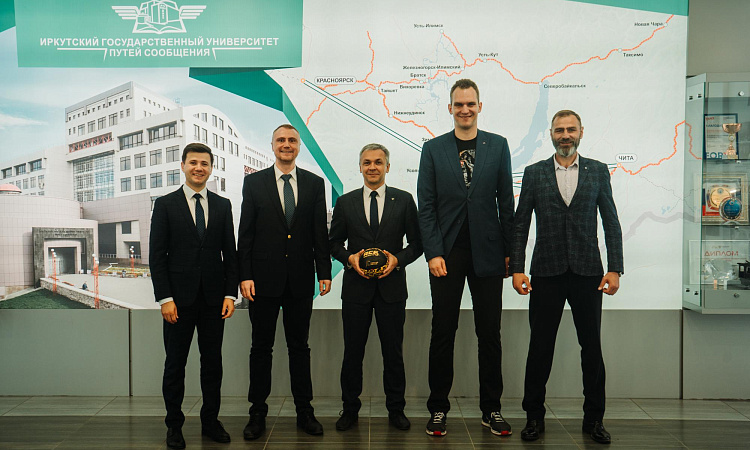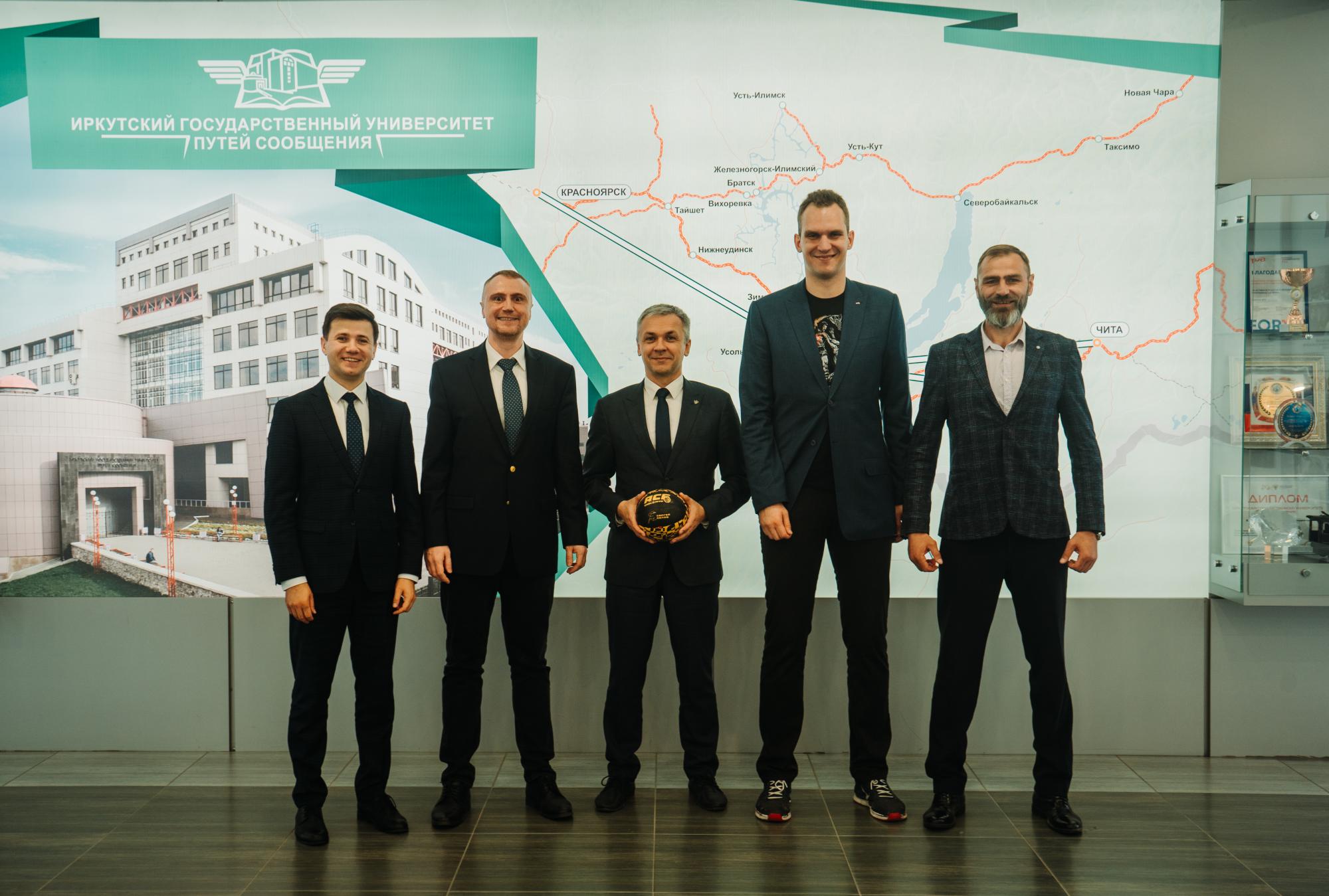 В ИрГУПС прошла встреча ректора Университета Юрия Трофимова, проректора по воспитательной работе и молодежной политике ИрГУПС Артема Миронова, председателя Федерации баскетбола Иркутской области и менеджера команды "Локомотив ИрГУПС" Юрия Ковалева с исполнительным директором АСБ Сергеем Крюковым и генеральным менеджером студенческой лиги ОАО "РЖД" Анатолием Кашировым.
