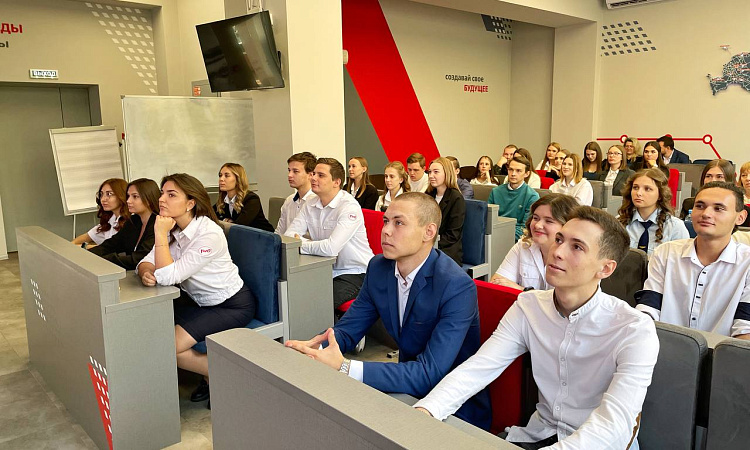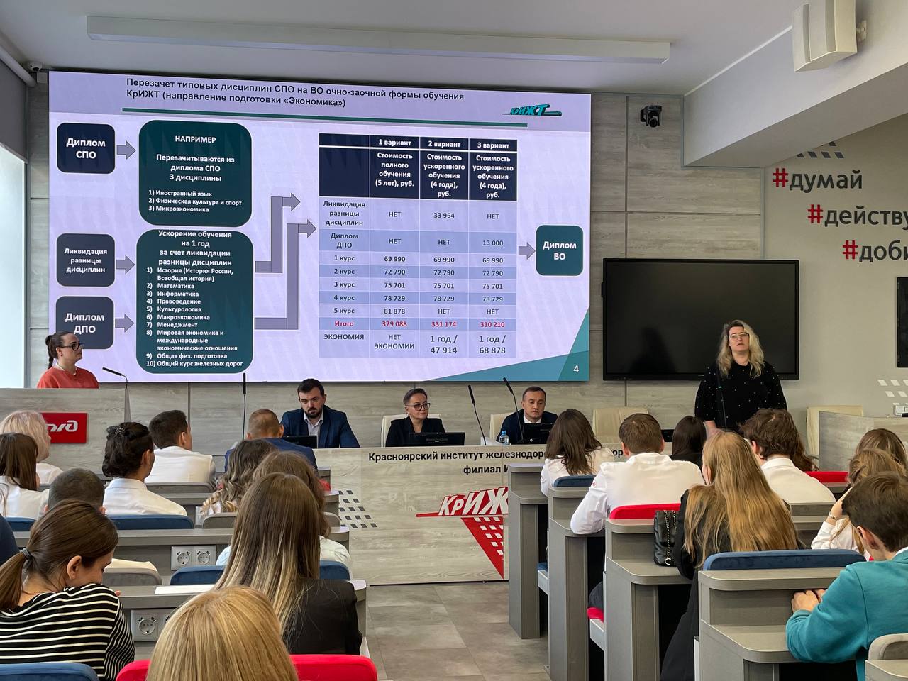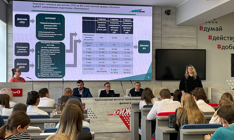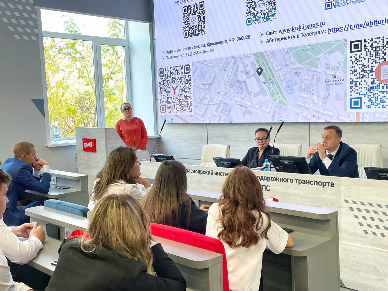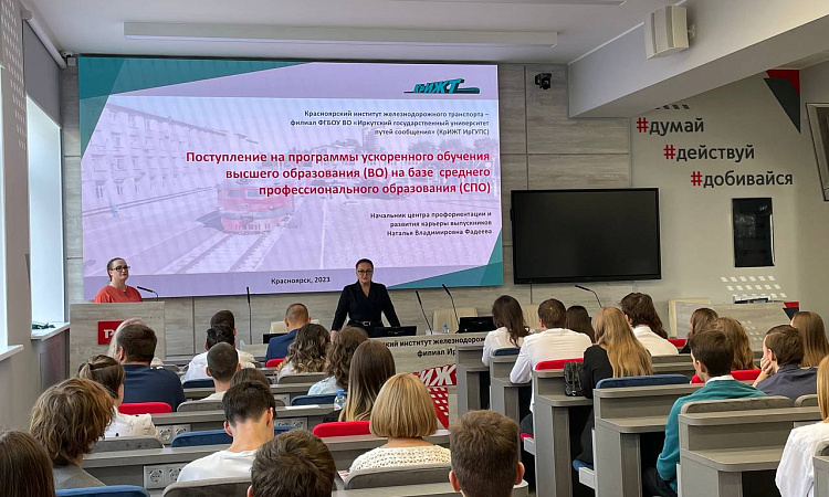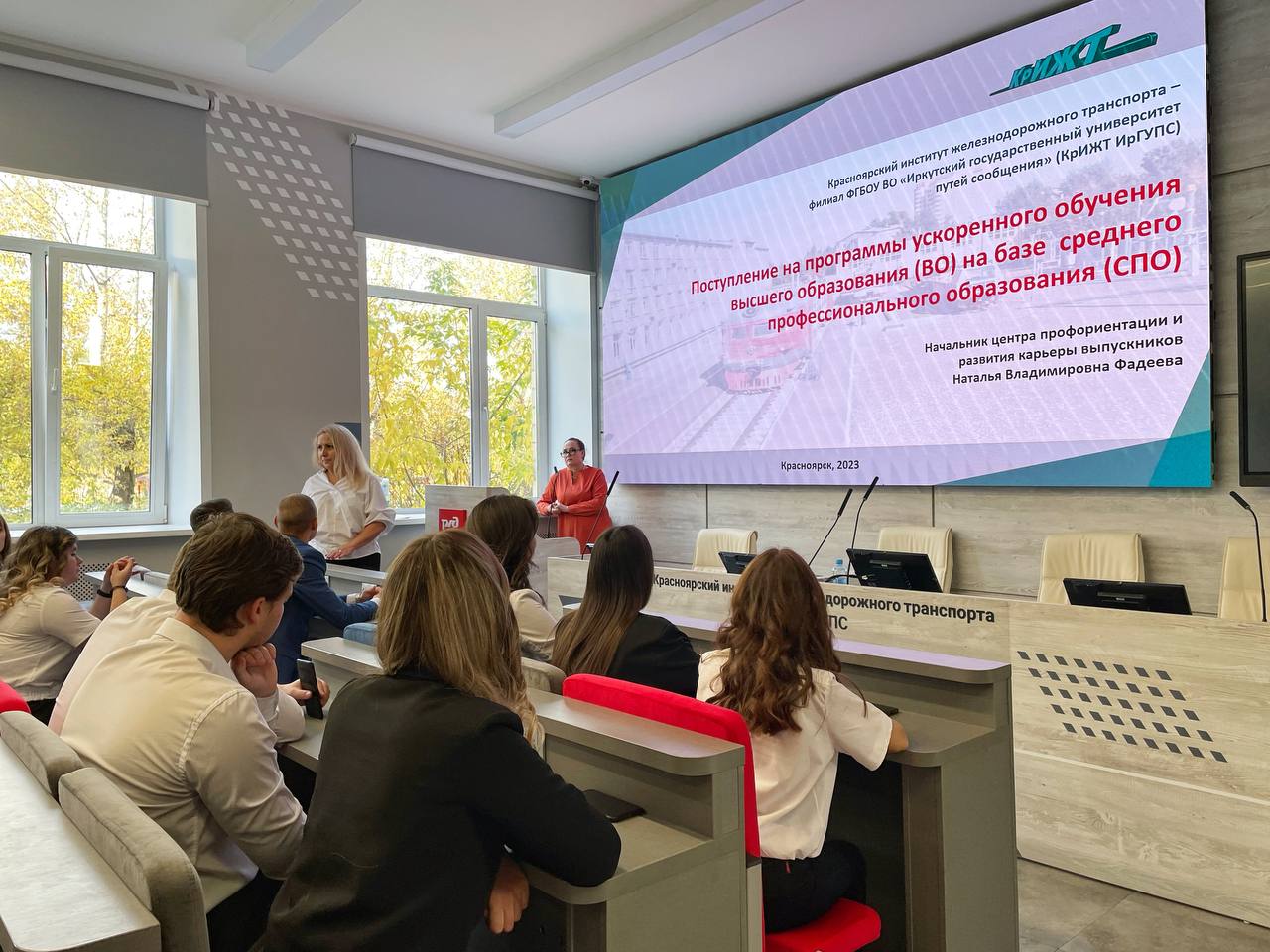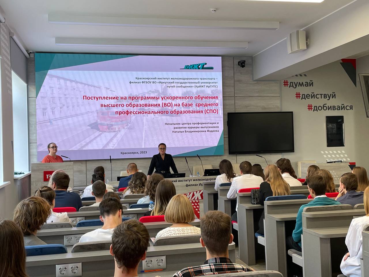 12 октября состоялась профориентационная встреча студентов СПО выпускных курсов групп ЭЛС.11-21-1, М.11-21-1 и Э.11-22-1 с директором КрИЖТ ИрГУПС Евгением Савченко и представителями ВО, в лице начальника ЦПРК Натальи Фадеевой, зав. кафедрой «Управление персоналом» Виталия Колмакова и декана факультета «Очное обучение» Альбины Даниловой.