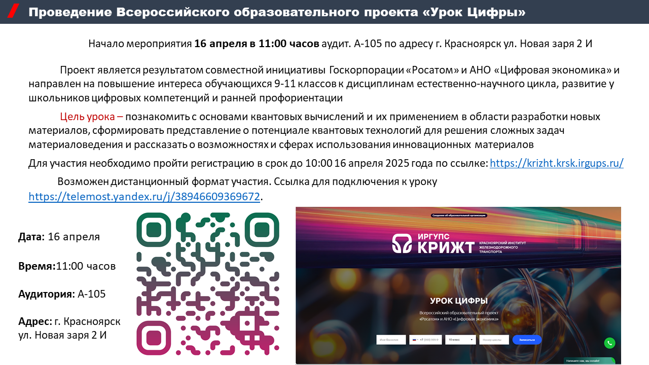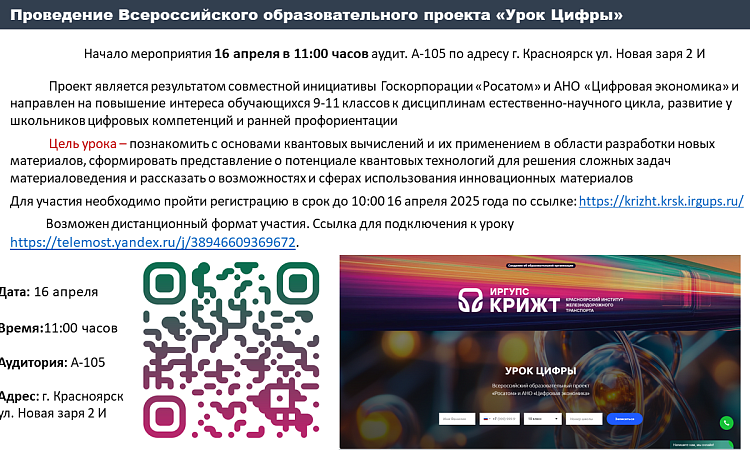 16 апреля 2025 года в 11:00 часов на базе Красноярского института железнодорожного транспорта – филиал ФГБОУ ВО «Иркутский государственный университет путей сообщения» представители Госкорпорации «Росатом» проведут урок «Урок Цифры» на тему «Квантовые вычисления и материалы будущего».