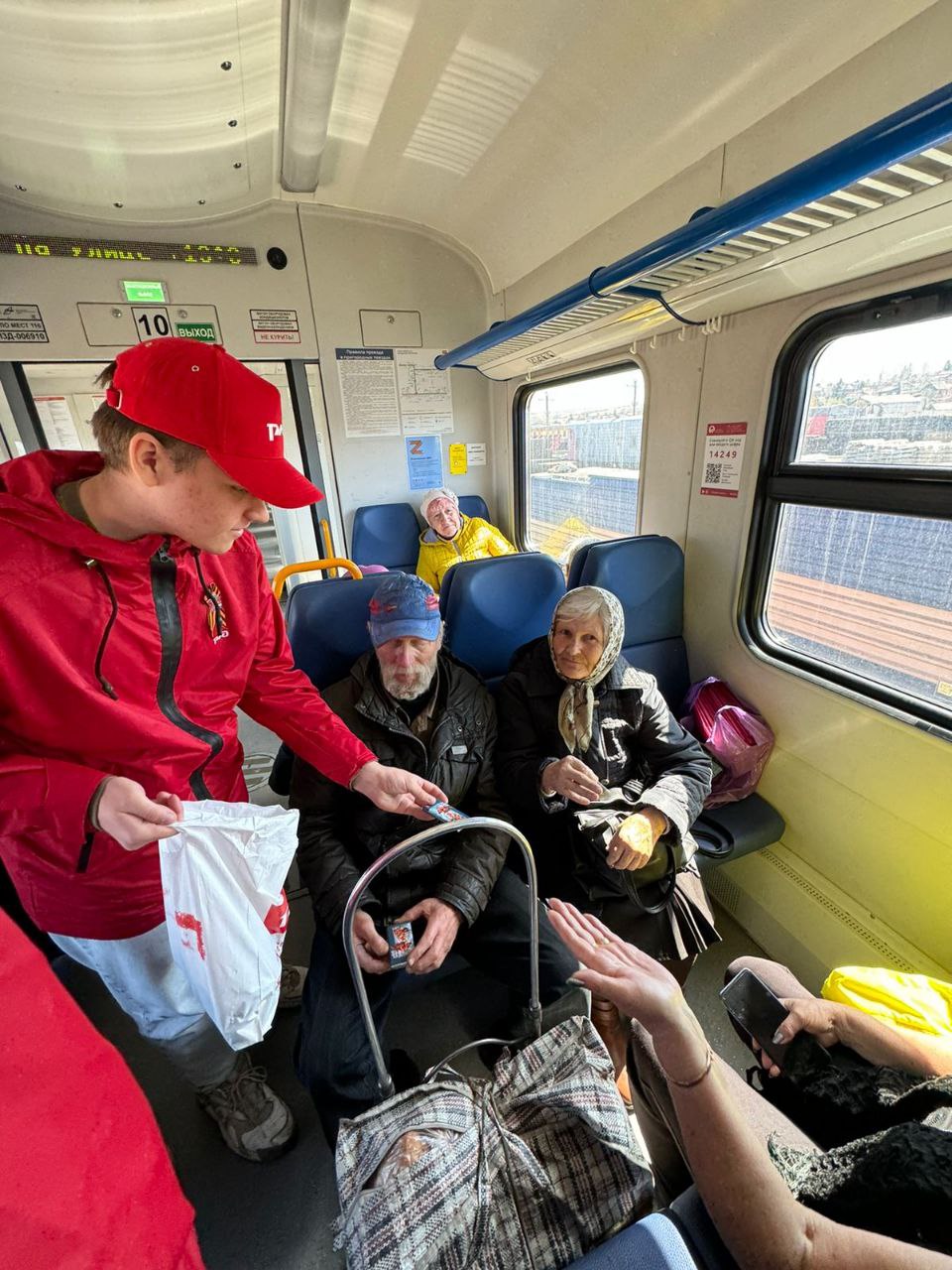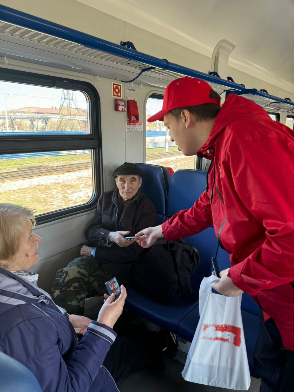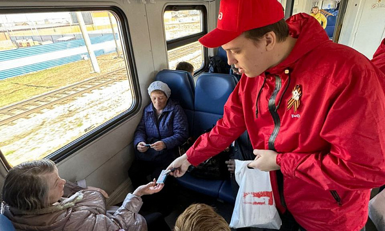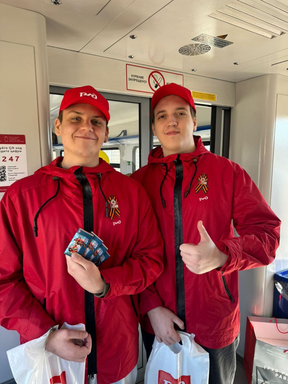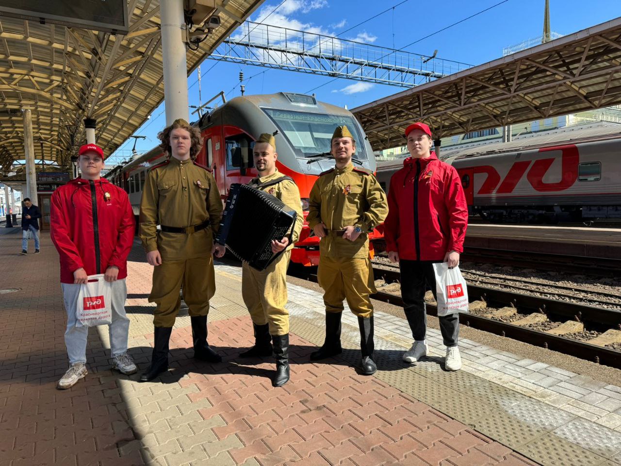 Песни, любимые многими поколениями, музыканты спели в образе выездного творческого коллектива, который во время Великой Отечественной войны гастролировал в местах расположения действующих частей Красной Армии и поднимал боевой дух наших солдат под аккомпанемент народных инструментов. Волонтеры поздравили пассажиров с наступающим праздником Днем Победы и подарили всем сладкие сувениры.