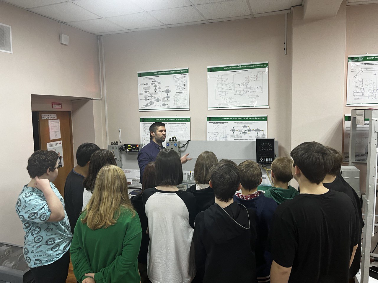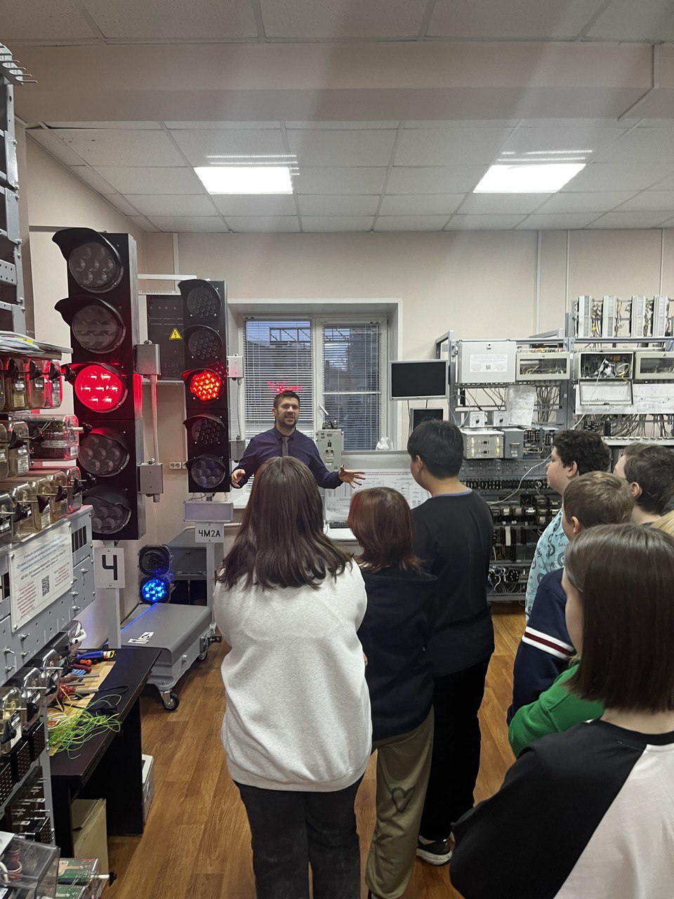 С помощью обучающего тренажера, который предназначен для изучения сигнализации на Входном и Выходном светофорах, ознакомились с принципом действия схем управления этими светофорами.