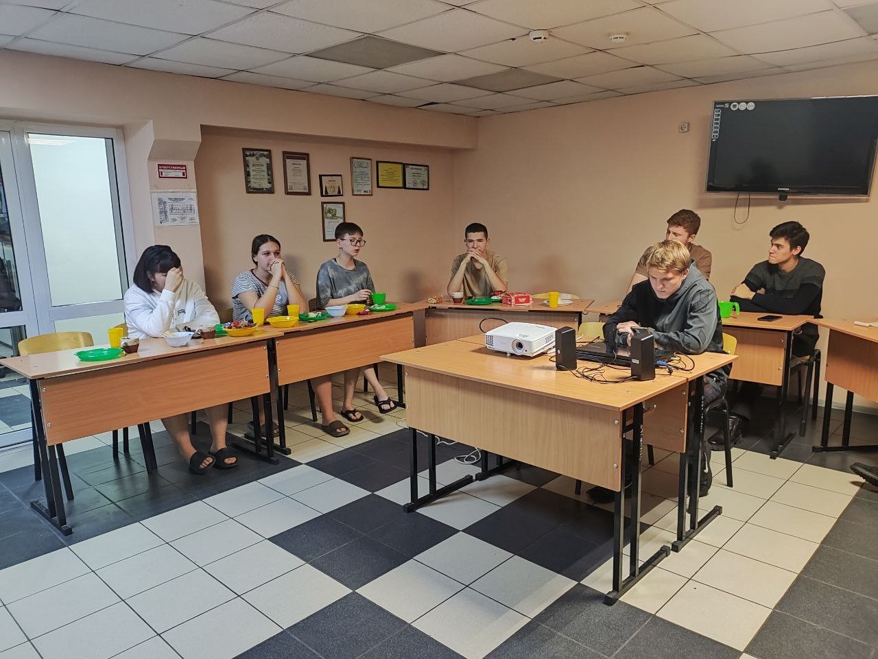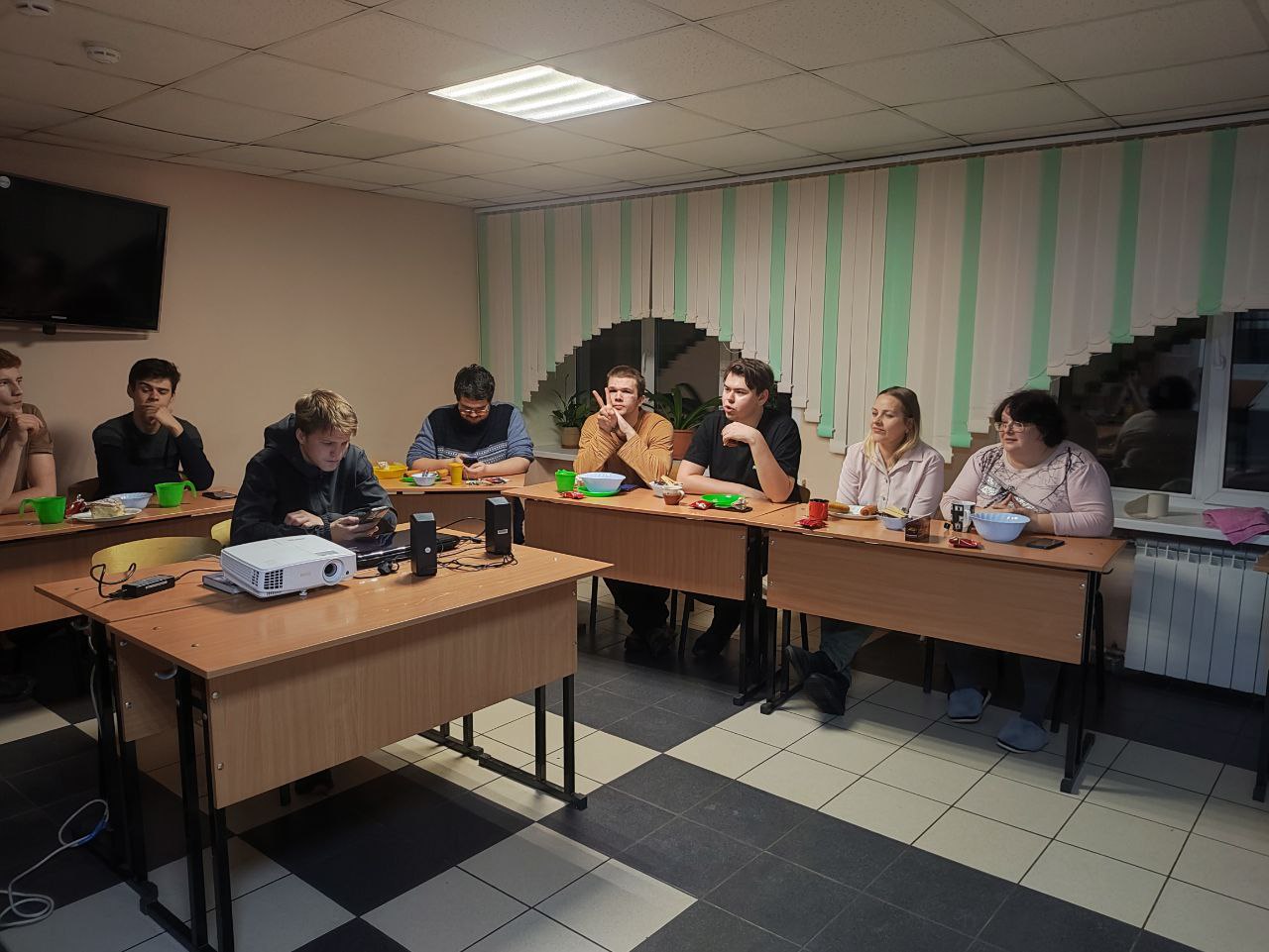 Юноши и девушки подготовили поздравления и юмористические сценки, загадывали загадки и весело рассказывали о буднях студентов. Чаепитие прошло в приятной и интересной атмосфере. В конце встречи участники посмотрели серию из сериала «Оливье и роботы» под названием «Процесс». Эта серия выполнена в стиле сюрреализма и рассказывает о том, как техника с искусственным интеллектом была приравнена к гражданам России. Им предоставили права на труд, отдых и даже забастовки, освободив от человеческого рабства.