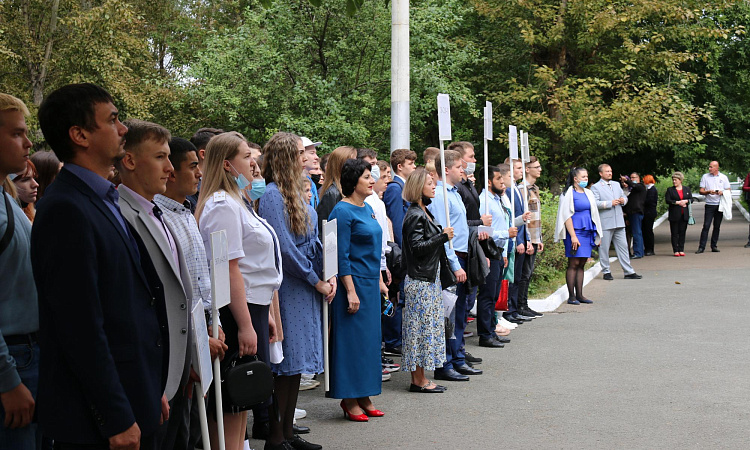 Нарядные первокурсники с радостью готовы вступить в новую студенческую жизнь. Звучит музыка, и группы строятся на торжественную линейку.