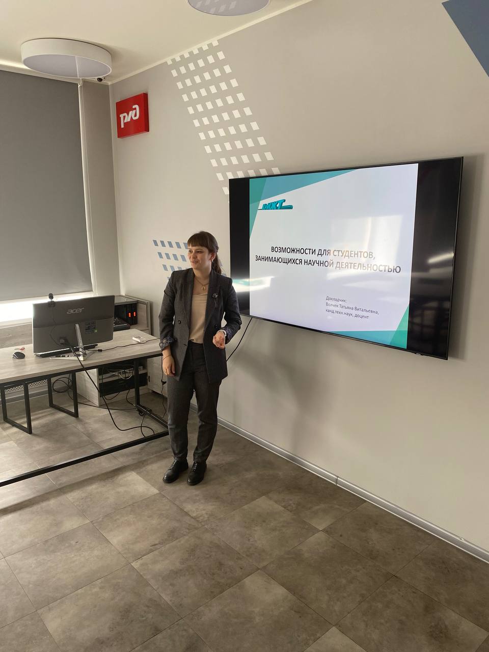 23 мая 2024 года В Красноярском институте железнодорожного транспорта кандидат технических наук, доцент Волчек Татьяна Витальевна провела лекцию для студентов кафедры «Эксплуатация железных дорог» на тему "Возможности в России для студентов, занимающихся научной деятельностью".
